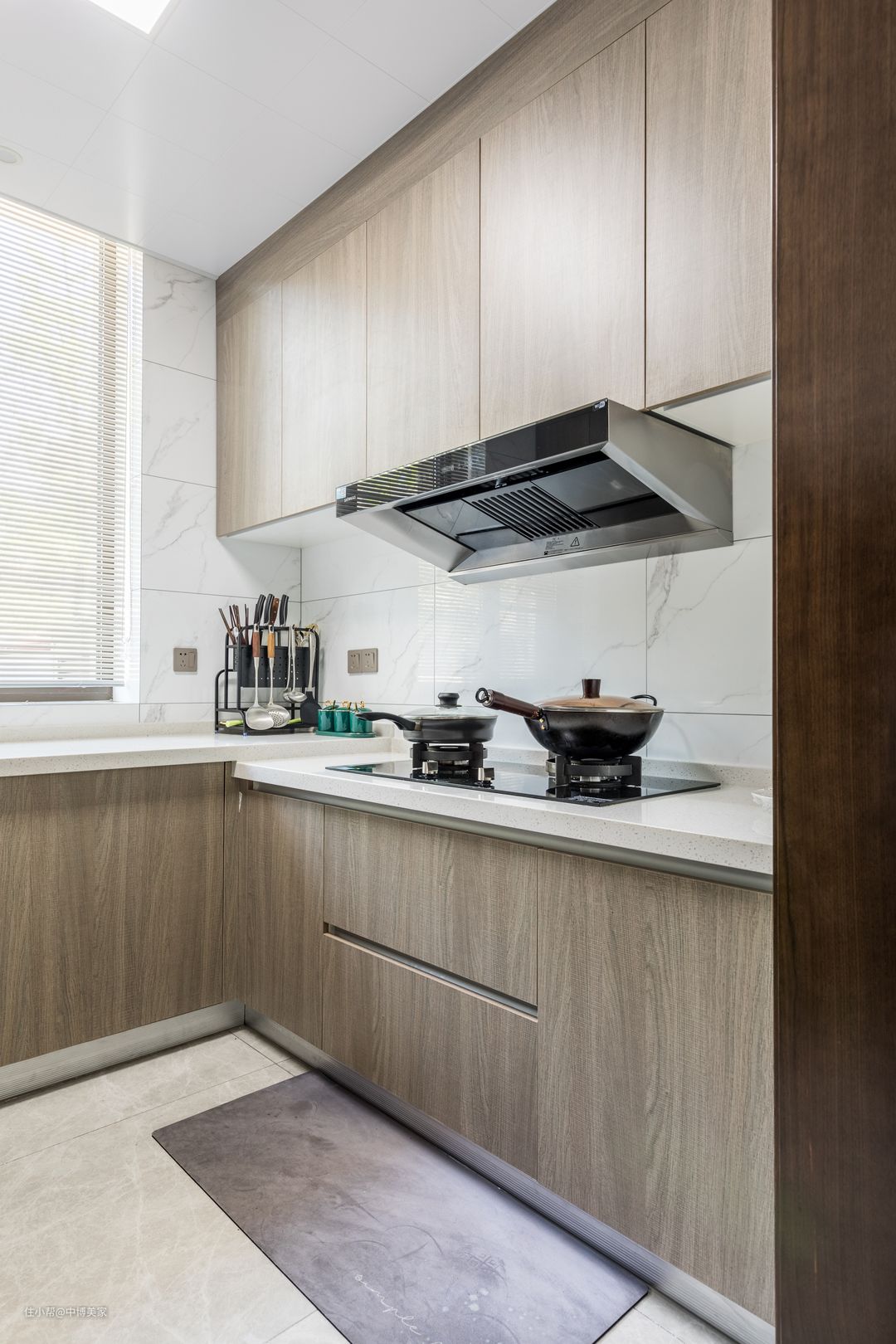 厨房用了胡桃色的柜子打造,温暖有型,收纳也更加方便。黑色的大型冰箱让爱好美食的主人在这里可以尽情展示自己的厨艺。