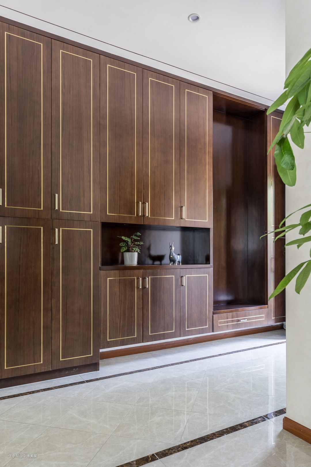 玄关处利用实木定制的柜子,可以存放更多的物品。水墨画的设计与青花色瓷器的碰撞是对传统文化的继承,整体空间在细节上凸显了中式的复古气息。