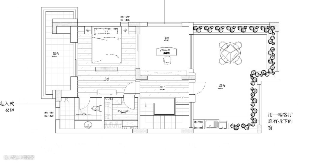 三楼的空间设计师是儿子房间。一半规划成大露台,一半休闲,一半洗衣晾晒。另一半则是一个大套房的形式,因为儿子工作关系,设计师专门作了一个书房,书房和卧室用移门隔开,空间通透还能防止干扰。