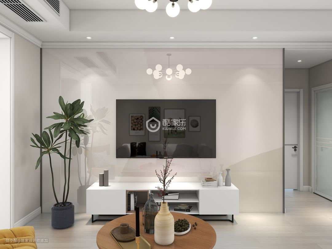 墙面立邦太空漫步NN0037-4,对于采光号的户型用浅灰色墙面,凸显空间大气,舒适,浅灰色,好搭配当下家居市场卖的家具吗,亦是百搭背景色。 地面采用比墙面色号深的浅灰木色哑光木地板。 吊顶是风管机加边顶。 电视墙选用订制集成墙板画,安装方便,效果简约,大方。 柜子选用白色拼框平板门+金色拉手+卡其色木纹柜体差色。 门和踢脚线用白色配合墙面浅灰色。 家具采用北欧木质家具+布艺沙发。 窗帘采用绿色系拼几何图案。 居家装饰画用的是植物与自然系列元素组合画。 灯具搭配的是具有北欧风格简约特性的黑色铁艺球泡灯。