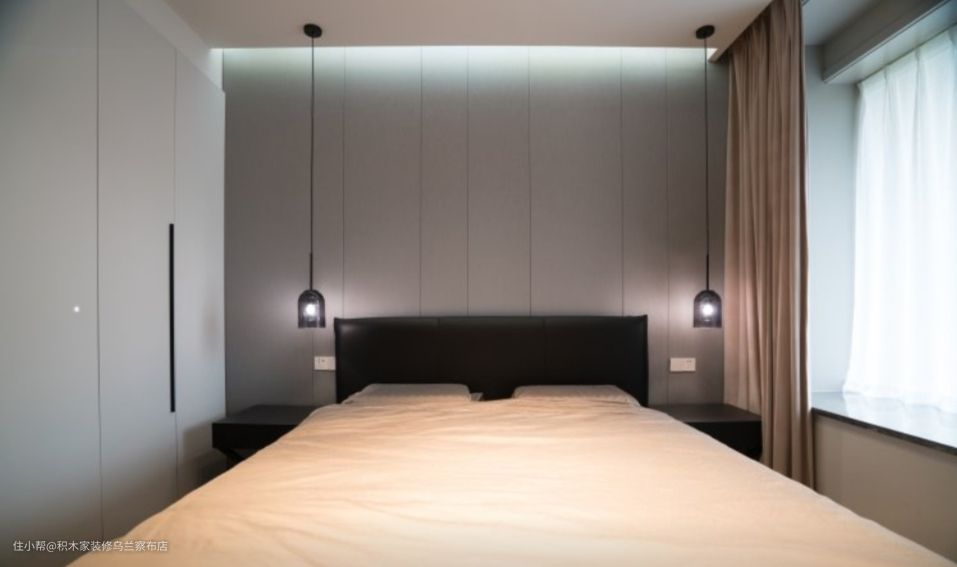 卧室就要简简单单、舒舒服服,所以色彩选择比较简单。灰色背景墙+白色衣柜,灰白也可以很温馨。卧室大灯以暖光为主,烘托卧室休息的作用。床头顶上方做了灯带设计,夜晚起床再也不用担心看不见还不刺眼。