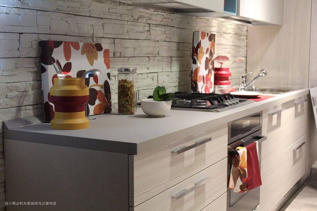 厨房延续客厅色调,复合木色橱柜搭配灰色台面,不规则木板上墙,整个氛围非常温馨。