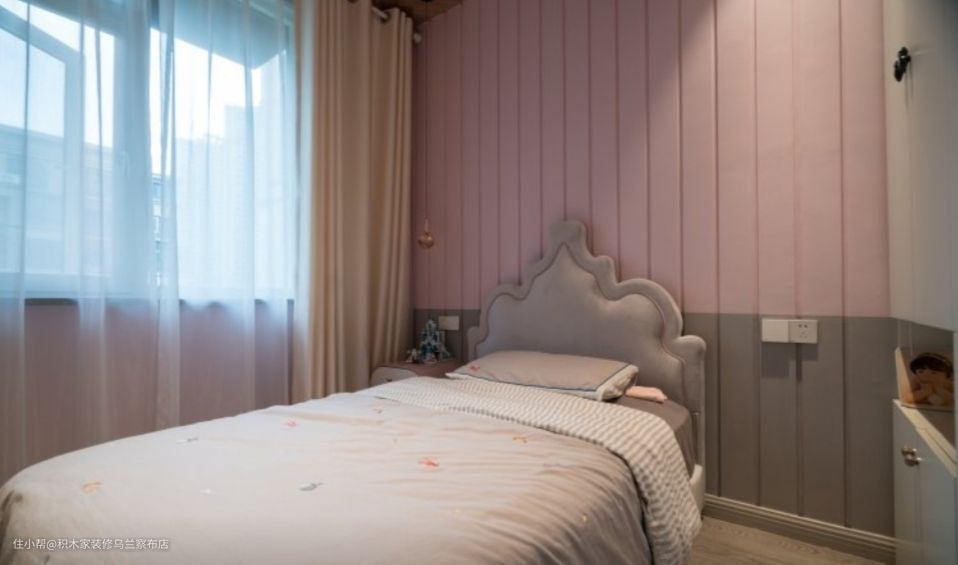 儿童房采用了小朋友的意见,粉灰拼接设计,旁边坐了通顶白色大衣柜,舍去靠近衣柜一侧的床头柜,将衣柜中间挑空,可以放点杂物。