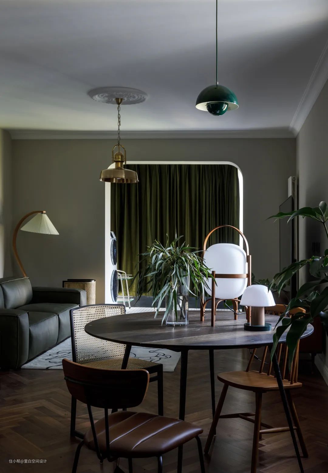 原来的用餐区在厨房对面,设计师把它调整到靠窗的位置,采光更好。从卧室出来第一眼看到就是餐区,屋主可以随着光影的不同变化,观察到这个区域的不同景致。一张深胡桃木色圆桌,搭配三把不同造型的餐椅,在经典花盆灯和绿植的配合下,协调出一种复古文艺的小确幸。