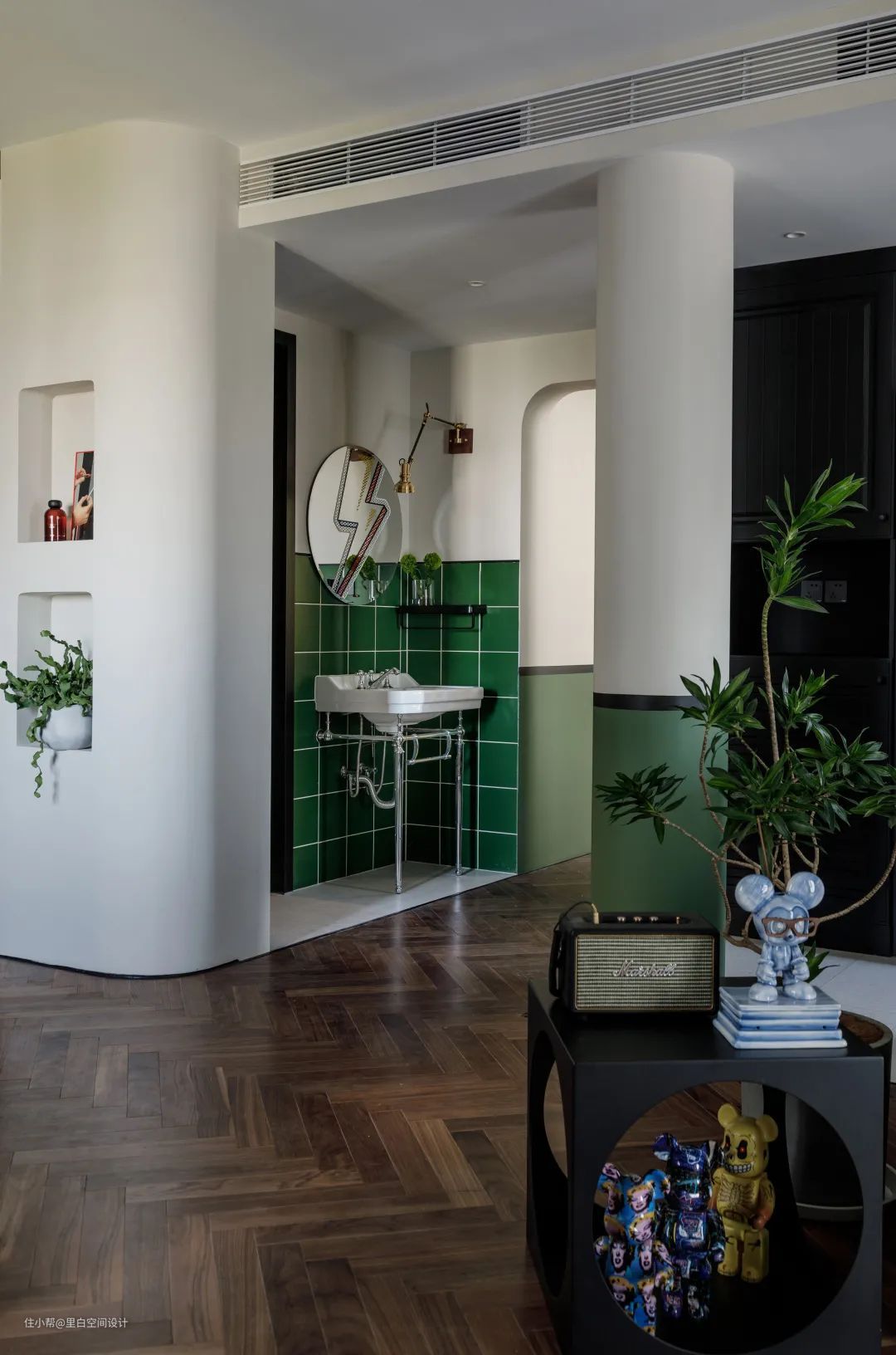 说到转角的圆弧形墙体,它的内部结构是由轻钢龙骨+石膏板组成。这种在开放式格局的延伸设计,可以同时满足收纳、区域分界的需求,而墙体本身的造型和材料质感,又为空间增加了层次的丰富。它一墙可以两用,一面给客厅做壁龛装饰,另外一面给卫生间洗手区做收纳。