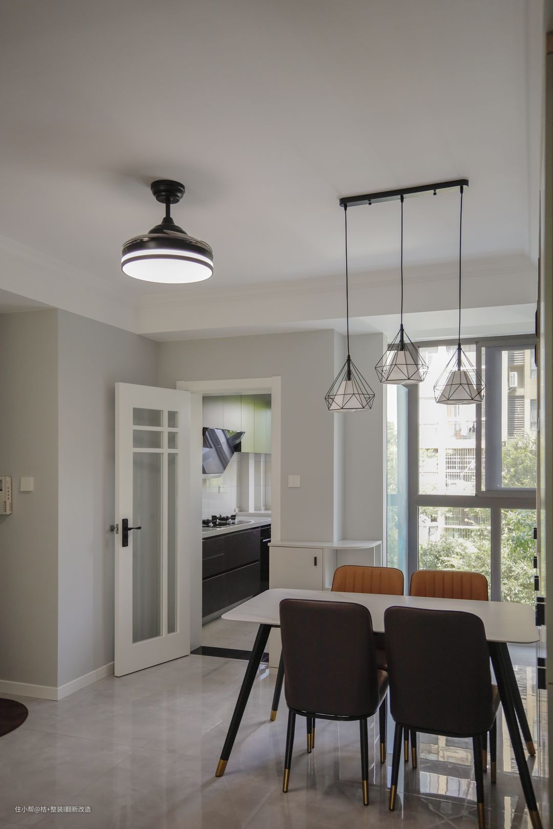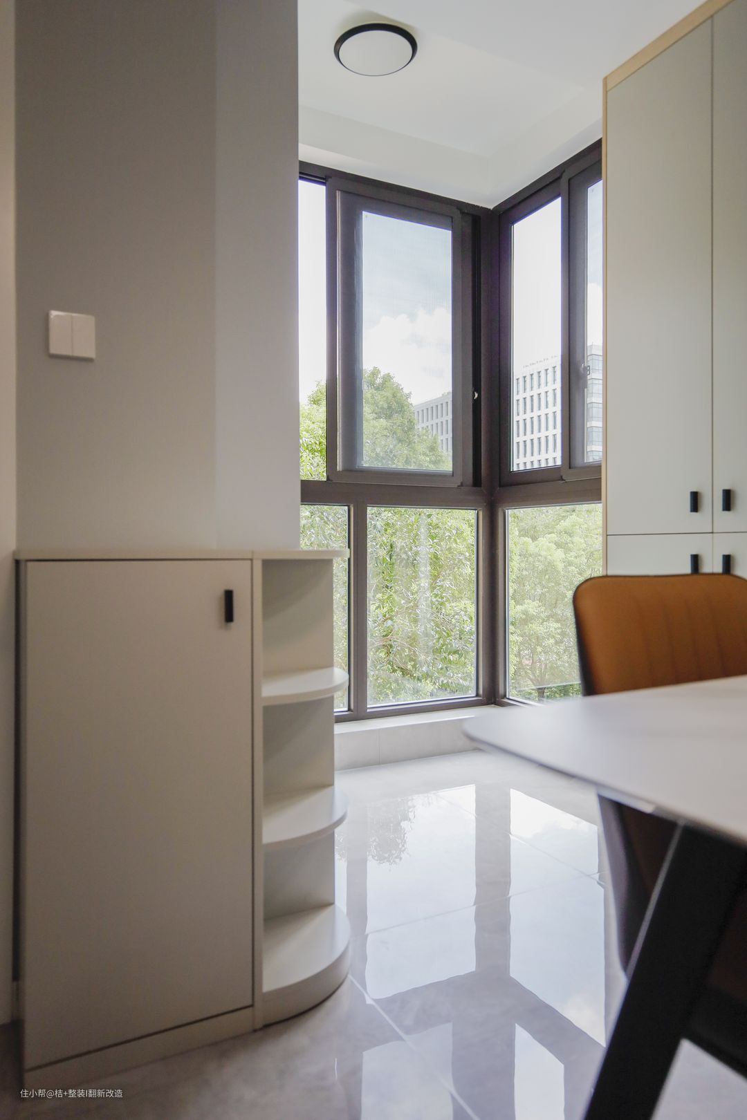 入户正对门就是餐厅的位置,由原来的卧室改造而来,与原过道相连的墙体同样做了拆除处理。 整体色调与客厅保持一致,一张简约白色圆角餐桌,四把黄色与棕色相配的餐椅,简单中透出一丝生机与活力。 紧挨餐桌,设计师在这里设计了一整面墙的、开放和封闭相结合的白色餐边柜,黑色把手简单点缀呈现出满满的高级感。 餐厅后面还有一个小小的阳台,安放一张休闲椅,躺下静静欣赏窗外的景色,慢时光的惬意就有啦! 同时,两面落地开窗设计,让室内采光更加充足,增加了整个空间的通透感。 餐厅进入厨房门口设置一个半高五斗柜,方便储物、摆放随手物品。