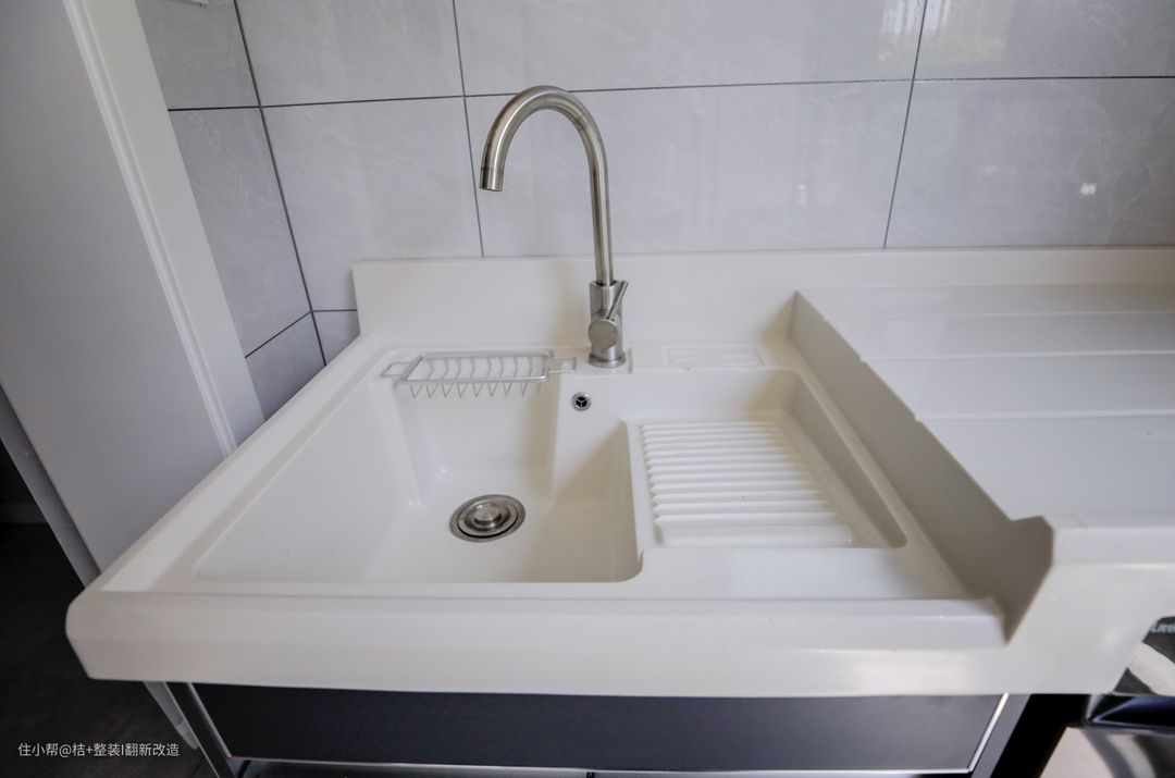 入户左手边就是厨房的位置,原来的厨房保留下来。不过为了动线更加合理化,厨房门洞的位置由原来朝向阳台改成了面向餐厅的方向。 厨房进门右手边,设计师利用空闲阳台位置,进行砌墙,将厨房冰箱嵌入,既不占用厨房空间,也能将闲置阳台空间充分利用起来。 (桔子匠去现场的时候冰箱还没有进场,所以,此处无图哦~~) 厨房根据洗-切-炒的动线需求,采用L型设计。高低台的设计更加符合人体操作需求。