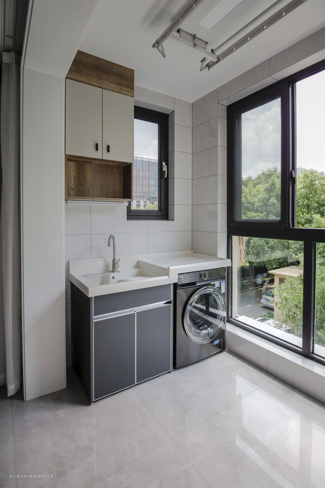客厅旁边的阳台被改造成了生活阳台,从客厅望向阳台,右手边设置了一个顶天立地柜,既方便储物,增强了整屋的储物能力,清洁打理也很方便。 左手边增设洗手台,并将洗衣机嵌入在内,洗衣晾晒都在这里,合理方便。 上面做了一个小小的吊柜设计。