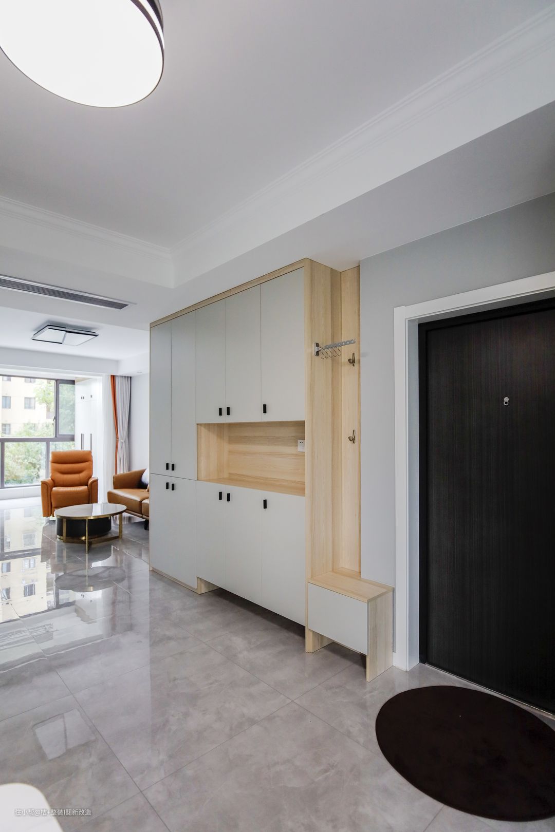 由于是三间一室户格局的设计,原户型这部分是闲置的。 改造后,入户右手边卧室墙体被拆除,将卧室和过道打通,在靠墙的位置设置整面墙的玄关柜,玄关柜自带换鞋凳,方便进出门换鞋。