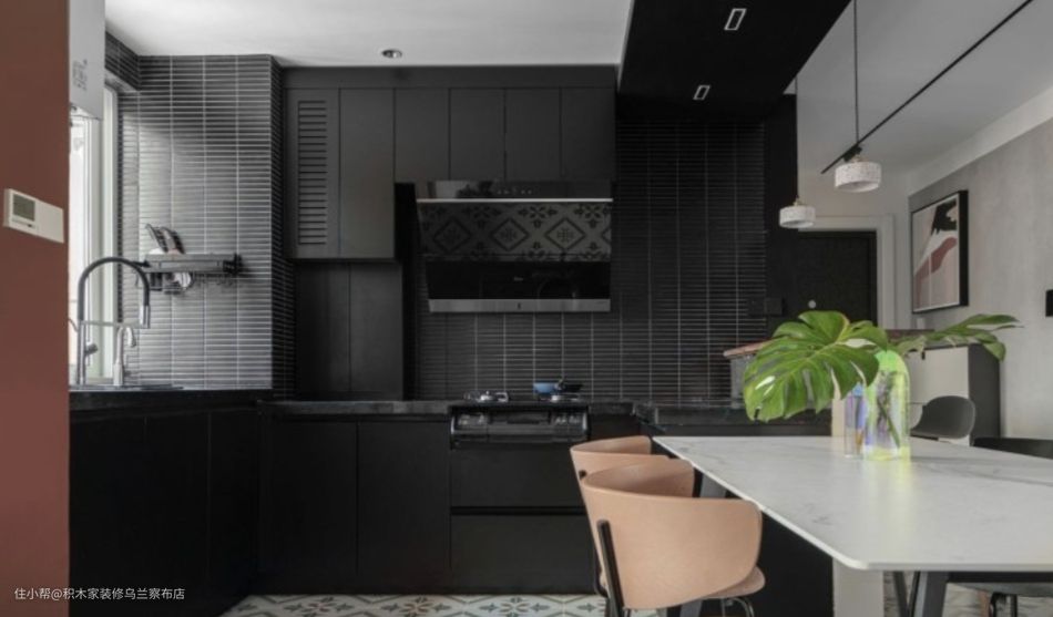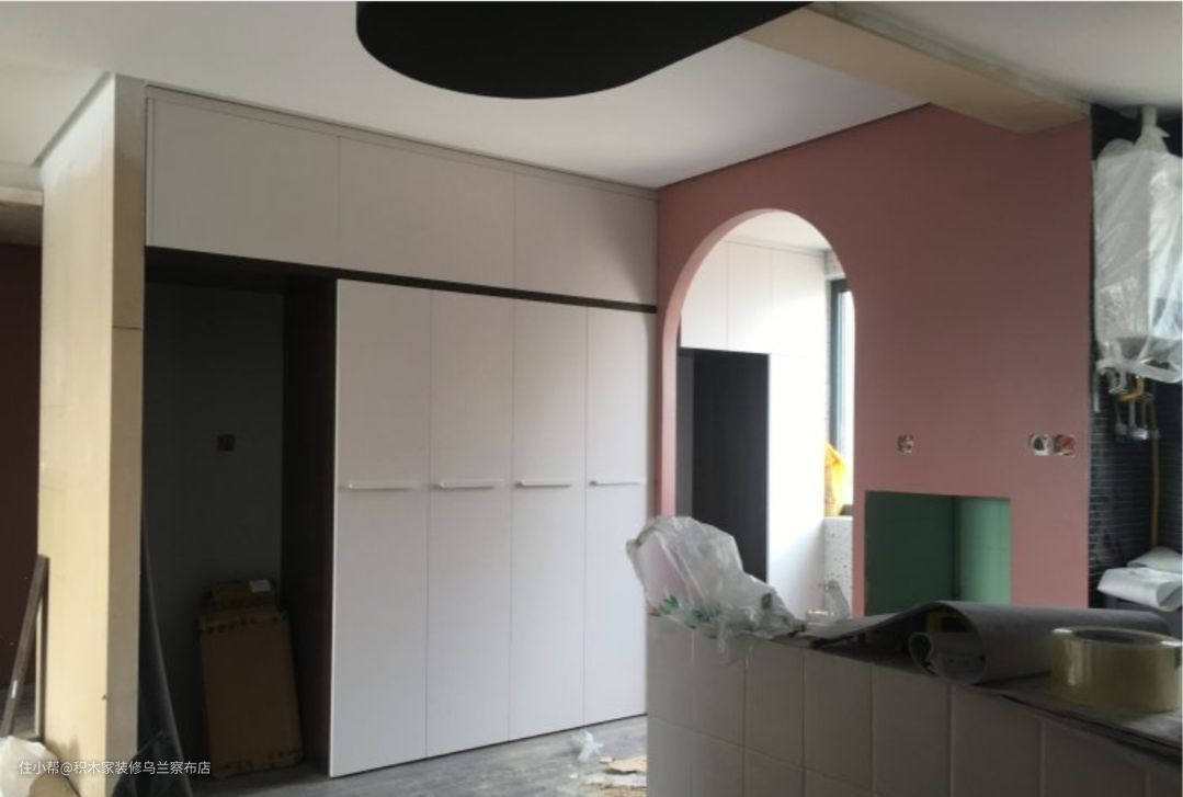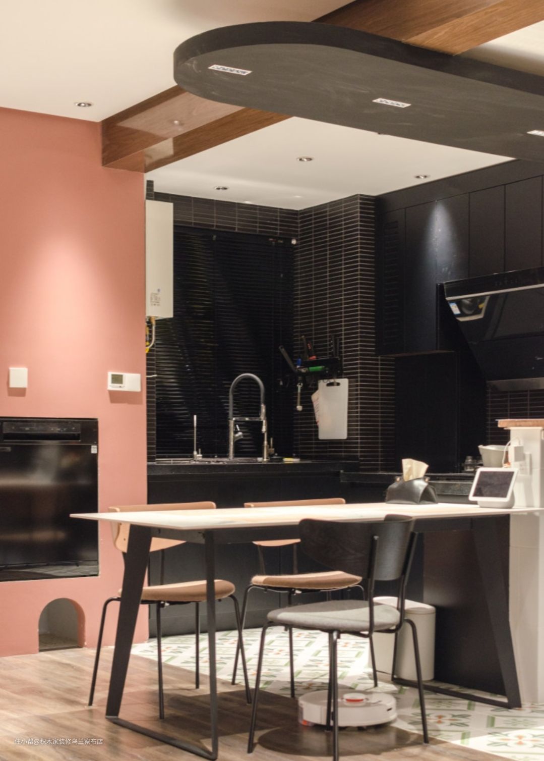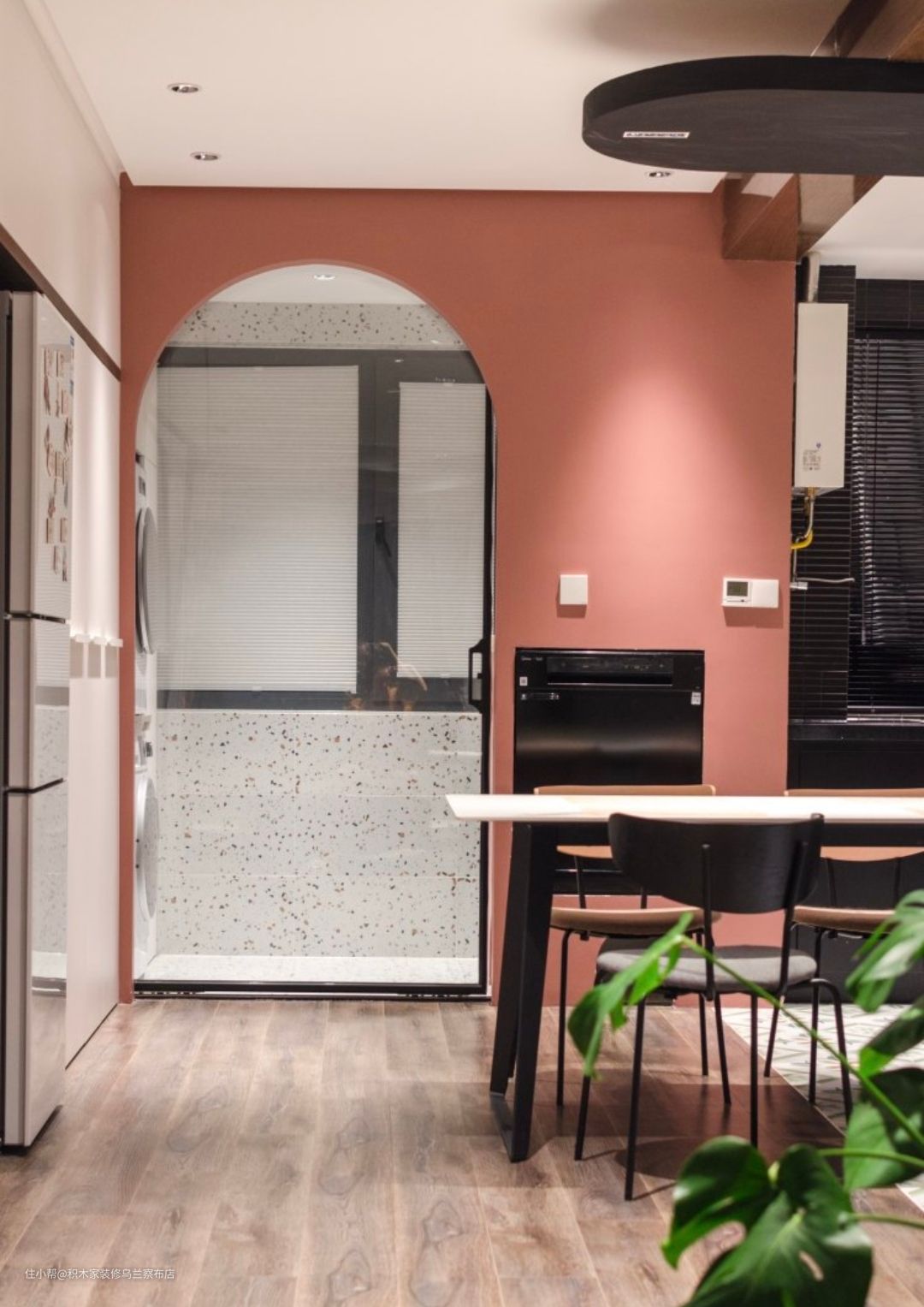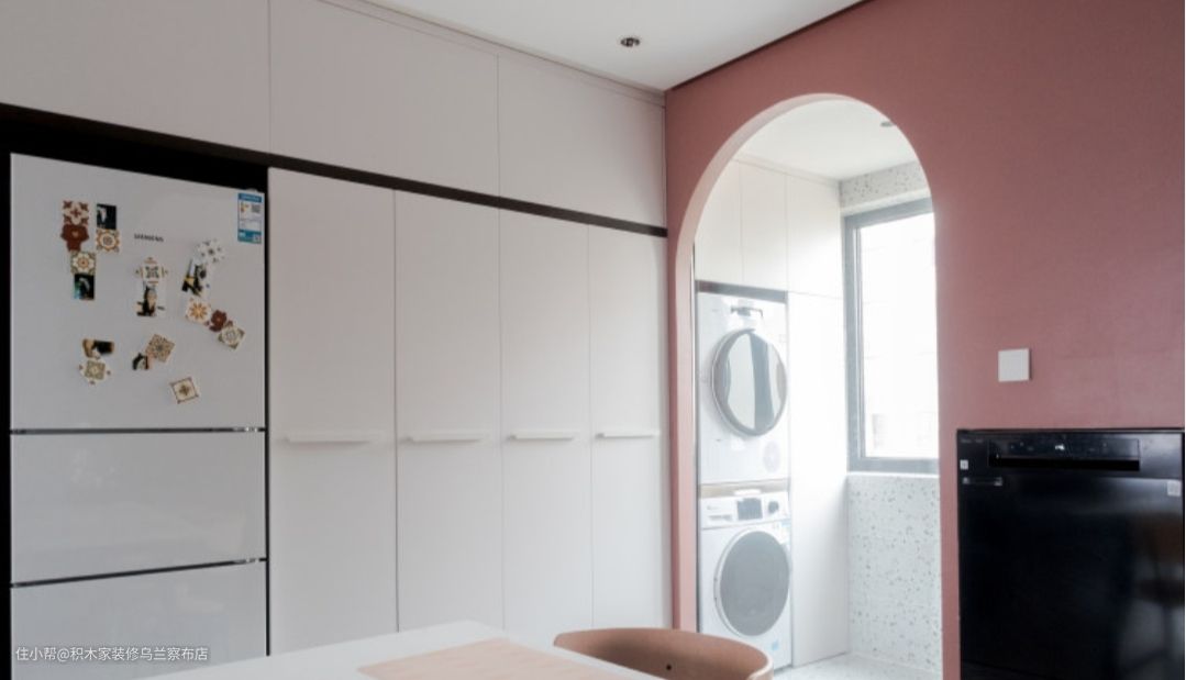 对于新的布局,拆除了厨房与餐厅的墙体后,餐桌直接从右侧橱柜延伸出来,做好饭菜拿取更加方便桌面采用大理石哑光花纹岩板,与粉色墙面中和了整个空间的冷感。餐厅另一侧做了餐边柜,冰箱内嵌,节省空间、增加收纳面积还非常便捷。
