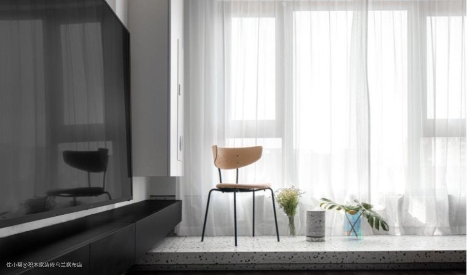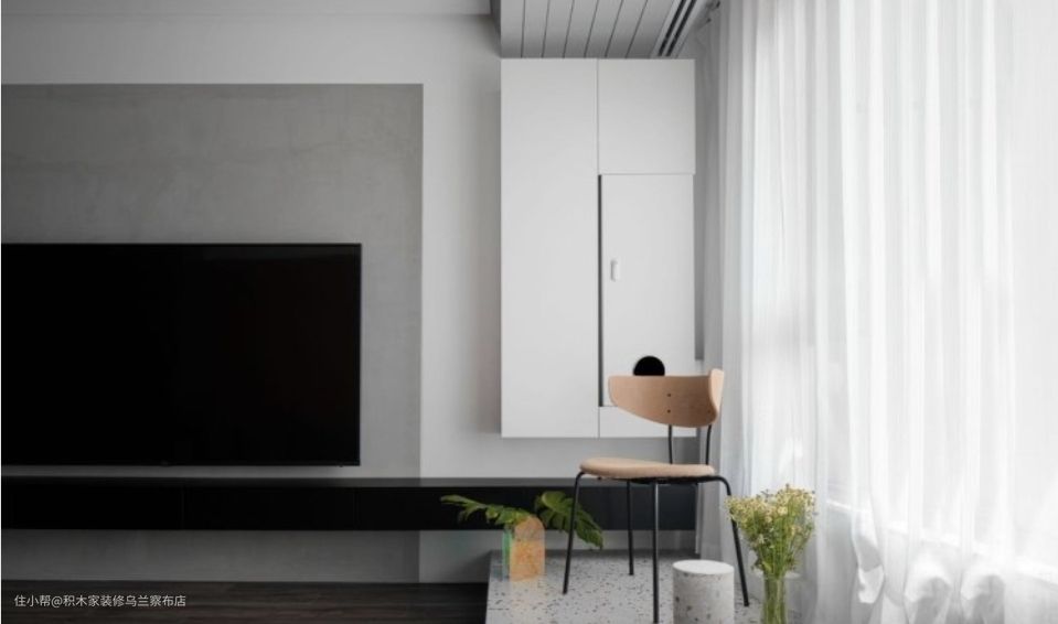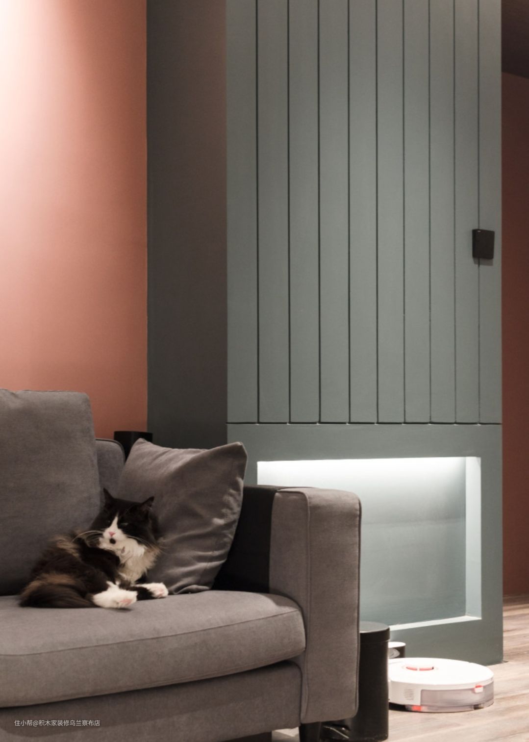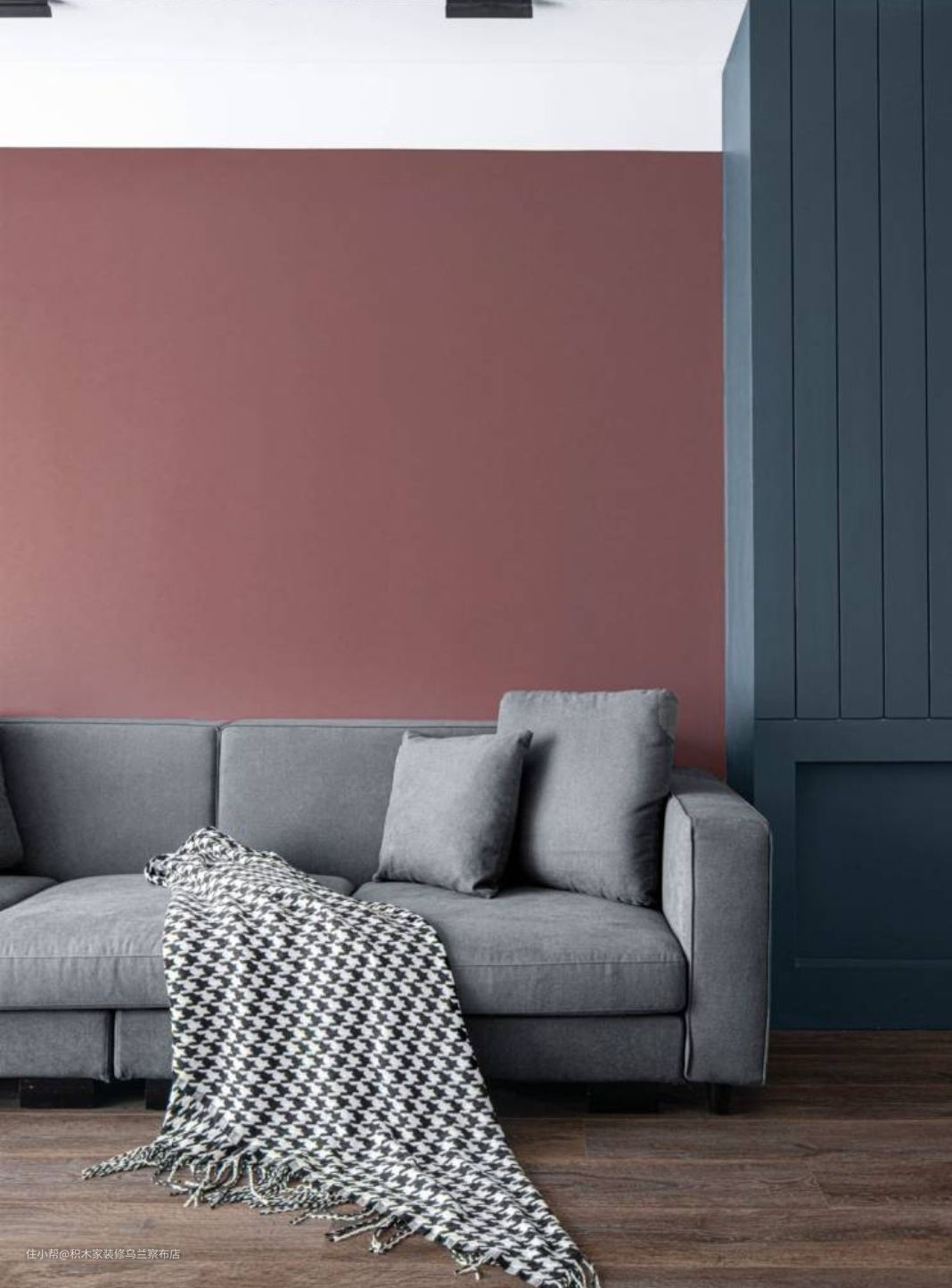 将玄关的灰色墙面延伸过来,一整面灰色墙显得空间非常大,沙发背景墙选择了肉粉色,中和灰、白的冷清单调感。电视柜做了悬空设计,上方可以放置一下杂物,下方悬空避免了卫生死角。阳台和客厅是连在一起的,在阳台做了地台设计,休闲看书也更加方便。