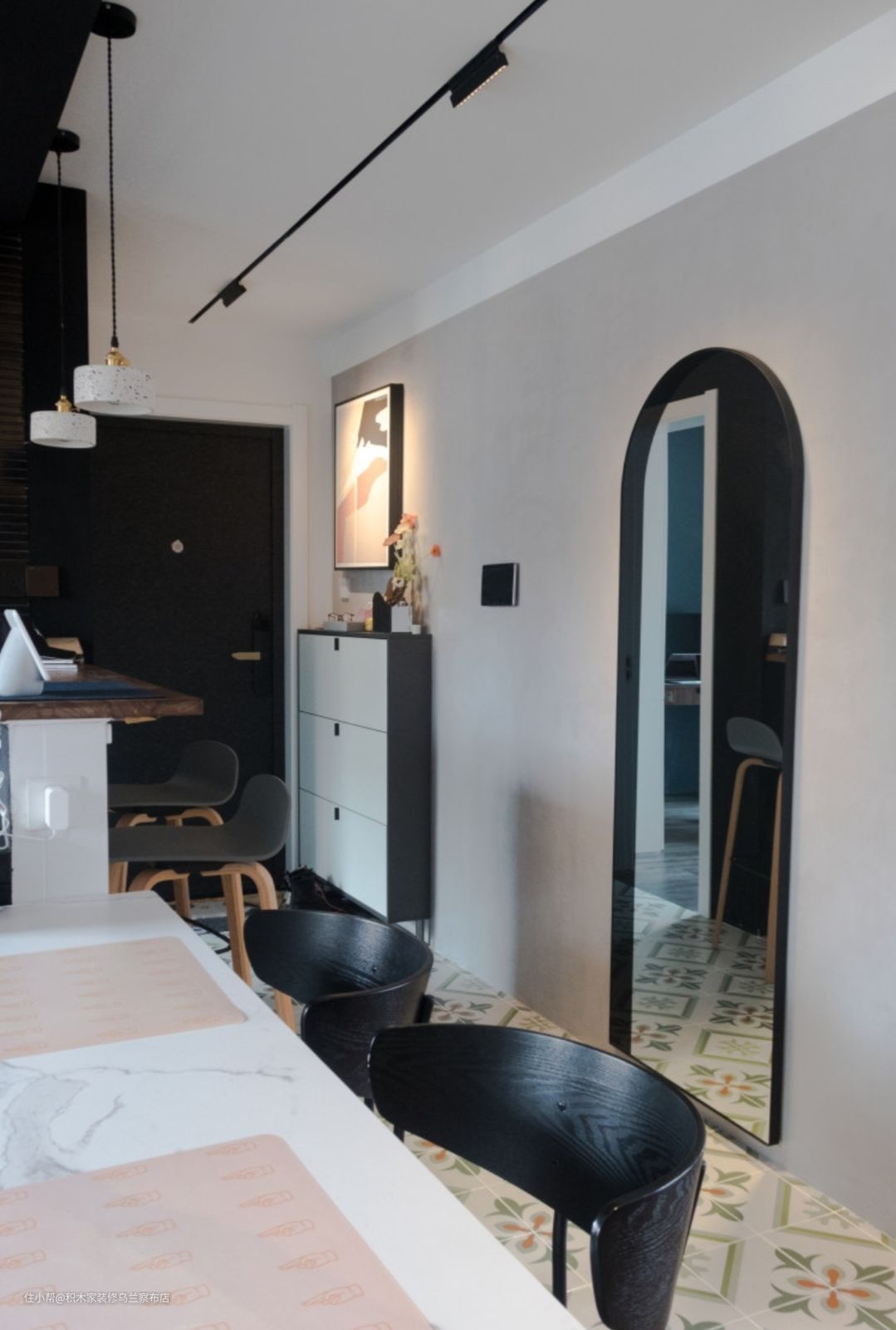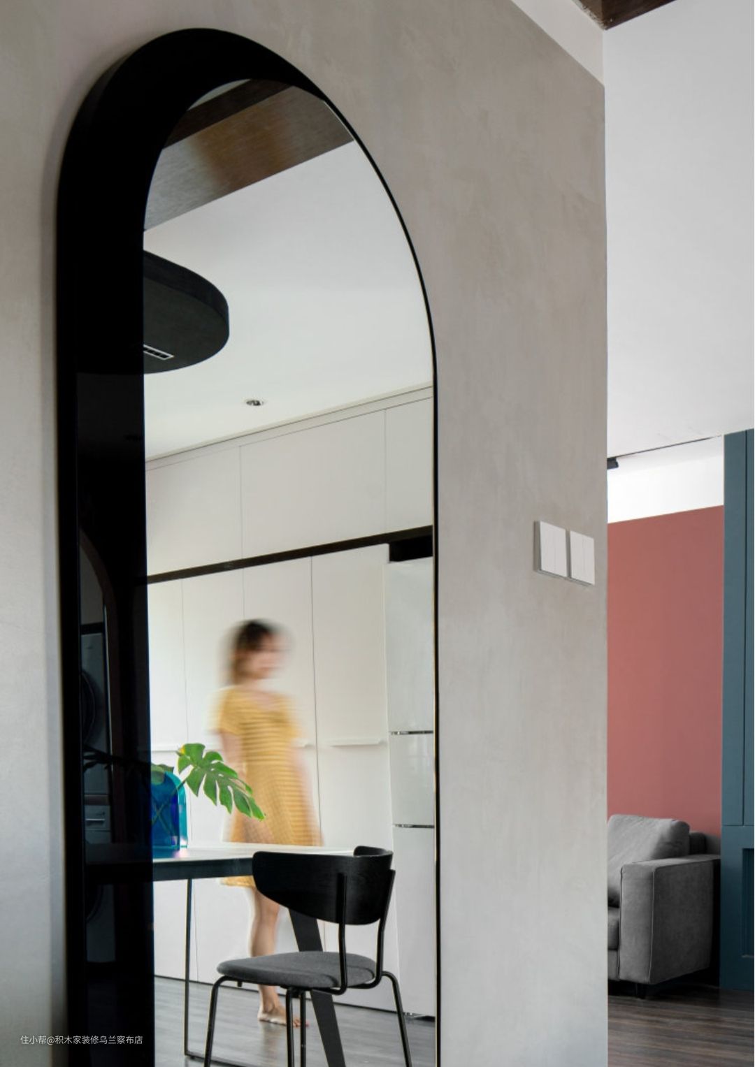 因为格局的改动,将原先玄关墙拆除,做了简单的超薄鞋柜。墙面用浅灰打底,给人一种舒适感,墙面安置了拱形全身镜,出门搭配非常方便,还能增加视觉空间。