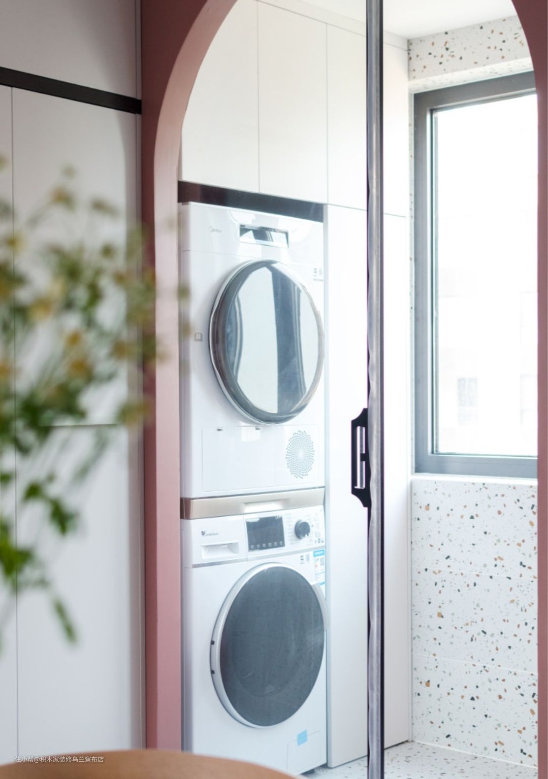 有两个阳台,一个客厅连接,做了地台,平时可以当做休闲、娱乐、放松的场所。一个和餐厅链接,也作为生活阳台,做了一面柜子,并将洗衣机与烘干机内嵌,增加收纳空间还节省面积。