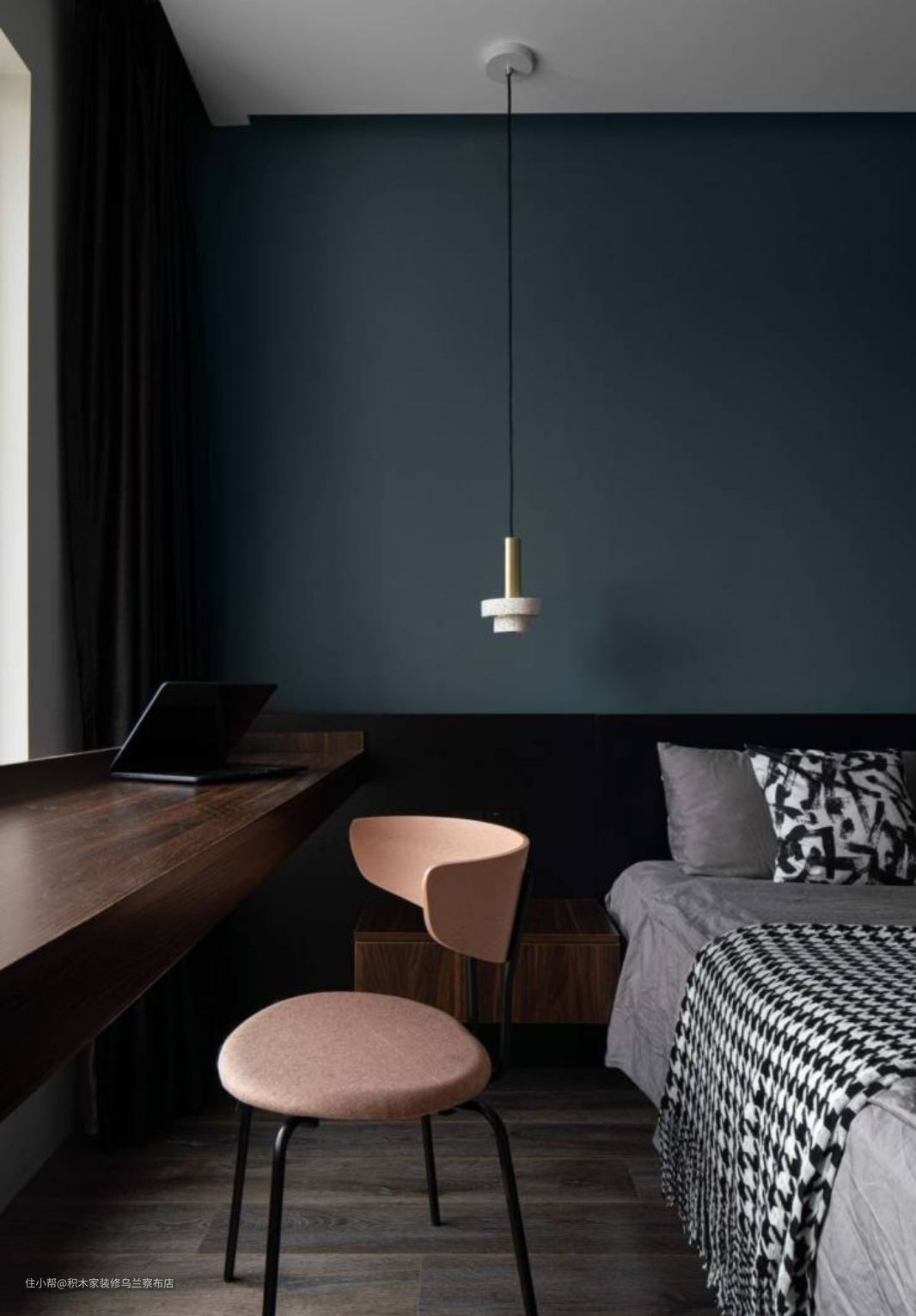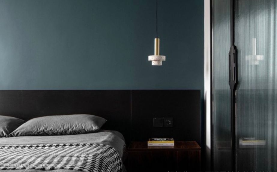 主卧做了拼接半墙设计,上方湖蓝绿搭配黑色,不仅不会觉得深沉,反而有一种高贵典雅感。窗台向内延伸做了书桌,因为主卧主要是大人区,所以书桌主要用来办公,没有选择书柜设计。两侧床头柜都采用悬空设计,有效避免卫生死角,打理也非常方便。