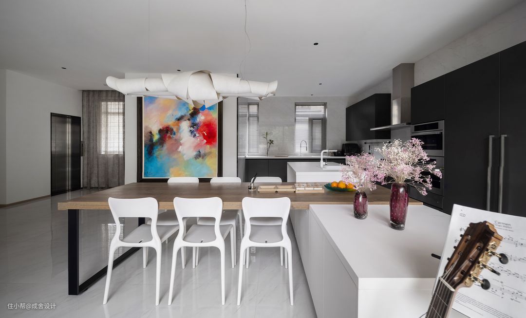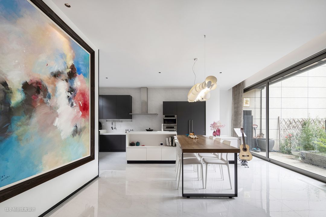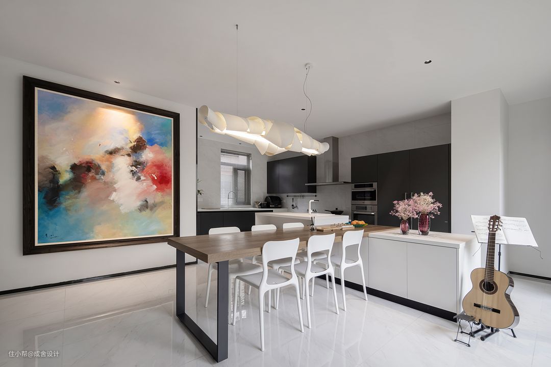 餐厅是一家人交流的核心,在餐厅设置一个吉他放置处,让空间的艺术氛围得到最大的发挥,同时也让家人之间的互动更加丰富有趣。