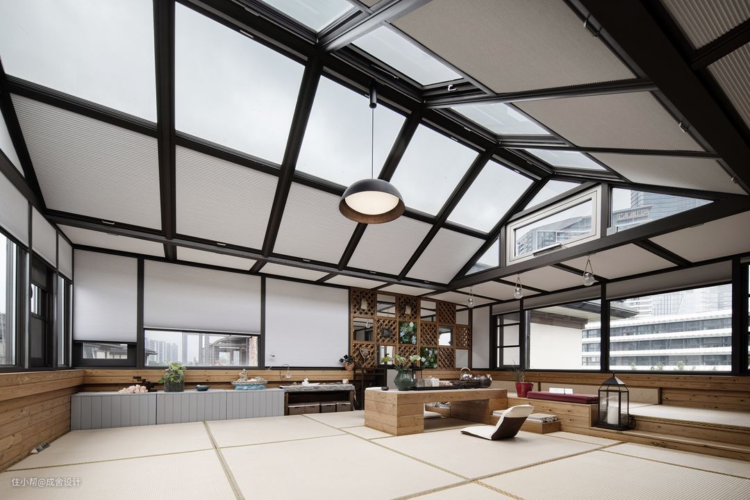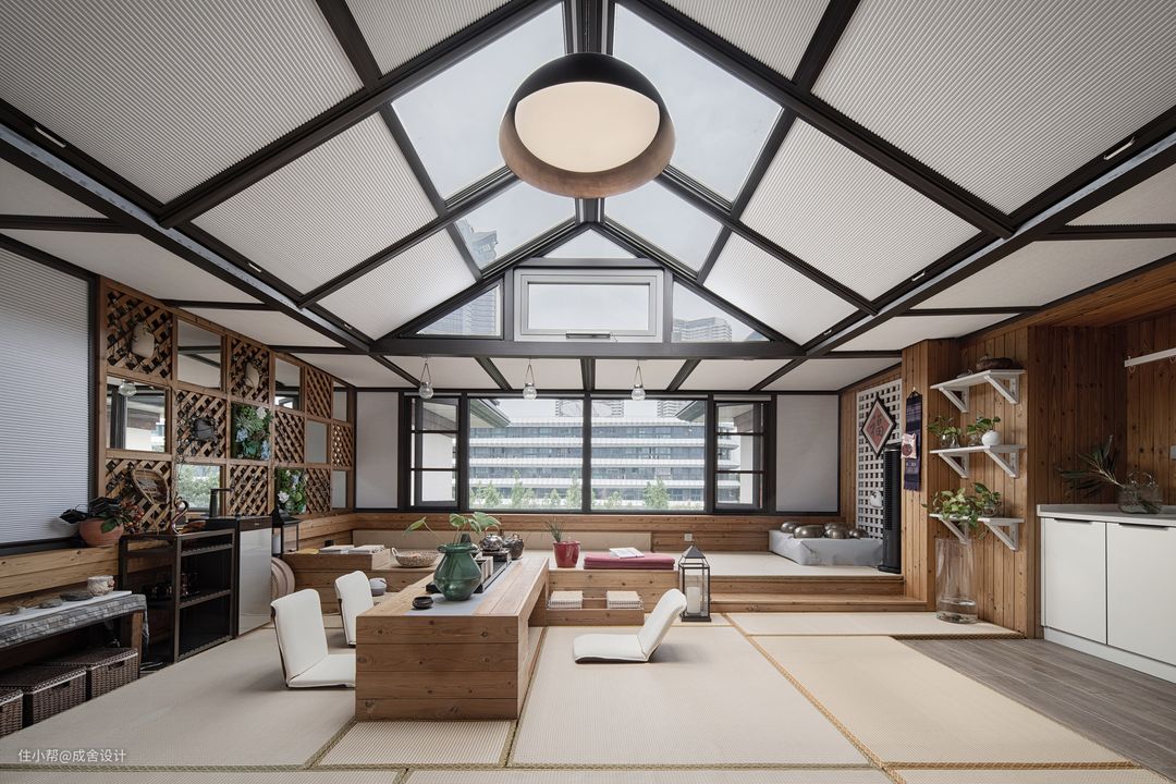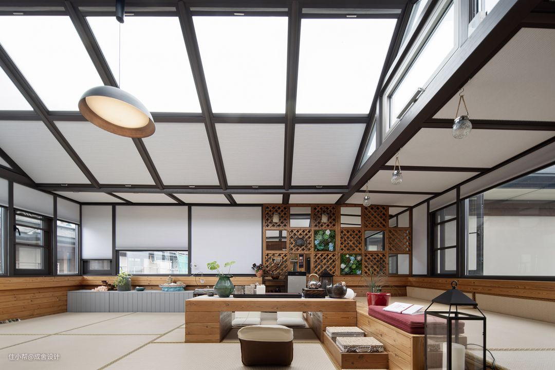 顶层的茶室,被质朴的木面所包围,创造了开放自由的起居情境,烹茶煮酒,随心而为。 将日式茶道的宗教之礼与中式茶道的修身养性融于设计之中,深刻诠释了屋主对“茶禅一心”的向往之意。