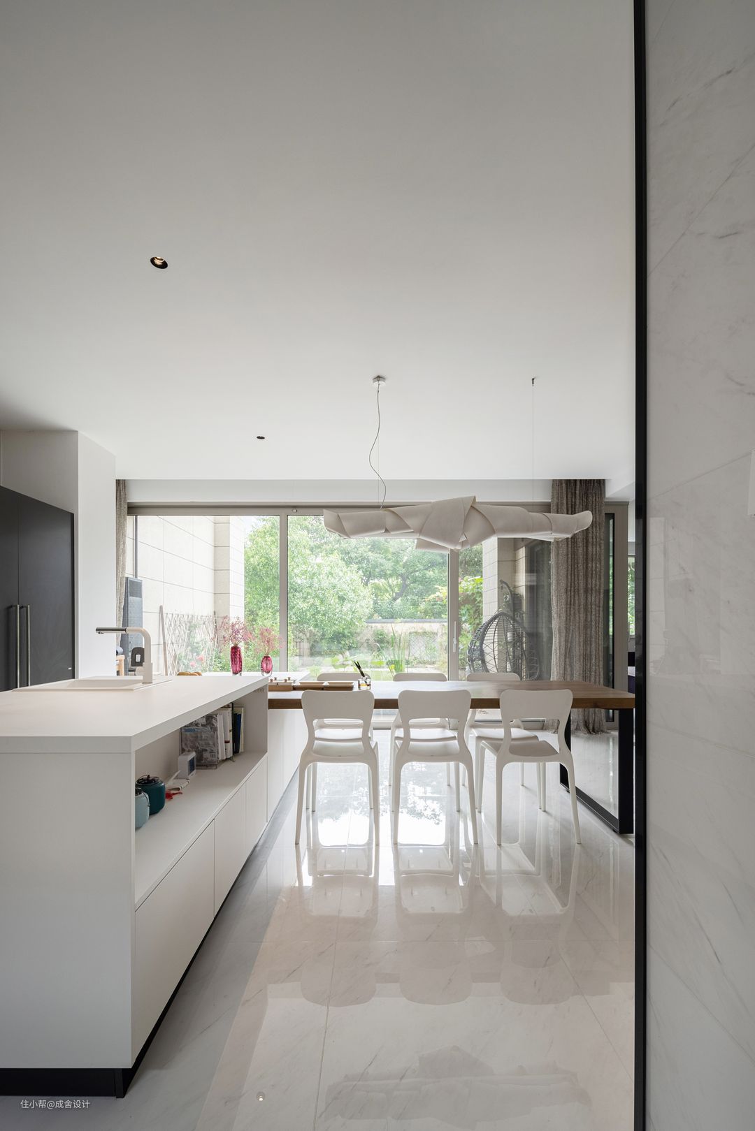 客厅的设计以极简白与原木的融合为基调,表达一种安静、纯粹的生活美学,同时也寻求着艺术与生活之间的平衡。在闲暇的时光里,感受绿色的生命力,温暖的阳光从落地窗投射进来,泡上一杯浓茶,欣赏着每一件藏品的精雕细琢,探索着古今中外的匠心独运,生活变得温暖而惬意。