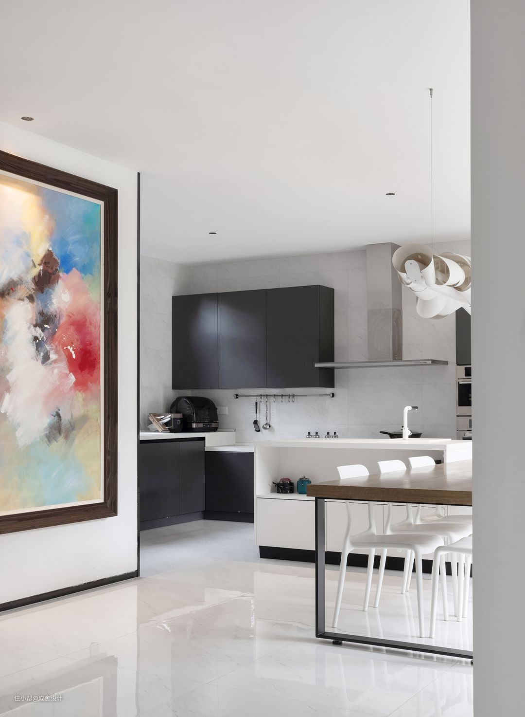 厨房柜体的门板选择了雅黑的色调,与空间的白色调呼应,配合多彩的艺术画,不会因为黑色让空间显得深沉压抑,反而因为这些色彩和冷暖的配合,展现出屋主细腻的艺术品位。另外,橱柜采用无把手设计,可以避免油污粘在把手上,难以清洗,也让整个空间更加美观,整齐划一。