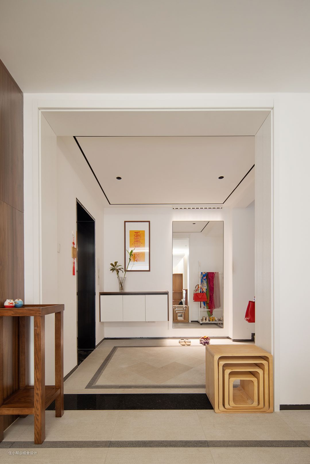 玄关配以悬空柜,更加美观大方。别致设计的换鞋凳,简约时尚,与空间的几何图形相呼应,很好的划分了空间,打造了一个和谐的居家环境。