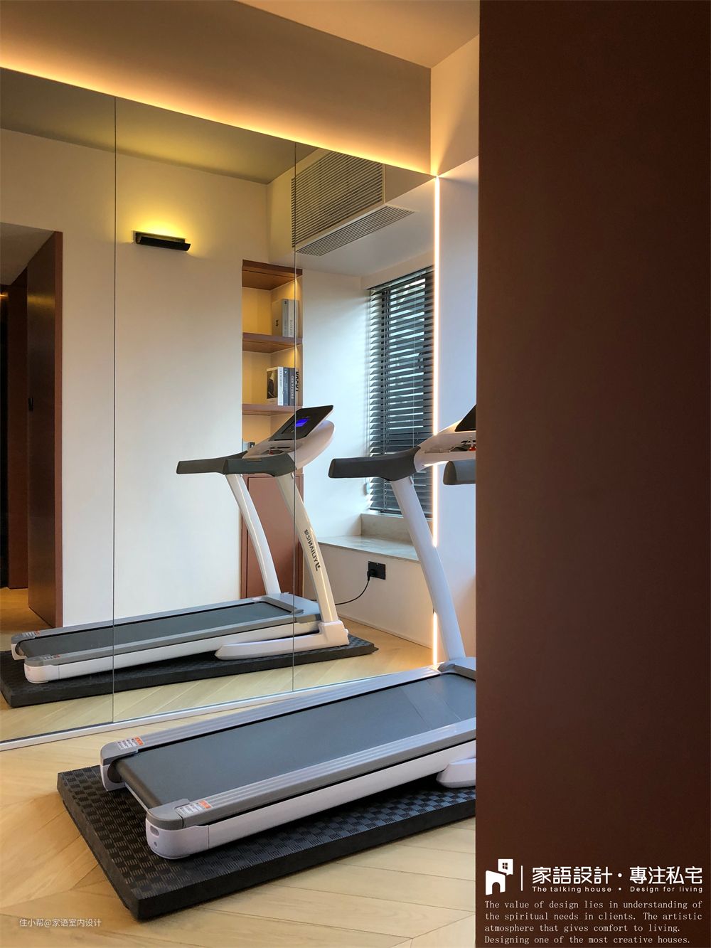 工作塞满了我们的时间,工作之余,运动能带来很多能量,因此我们要求家里有运动室。设计师使用大面积镜子模仿健身房环境,好多朋友看照片都直呼“你家为什么有两台跑步机?”“因为那是镜子!” 巧妙的是,镜子正对着从玄关走入家的入口处,镜子带来的空间延伸效果会让进入房子的人立即体会到超过实际面积的大空间感。