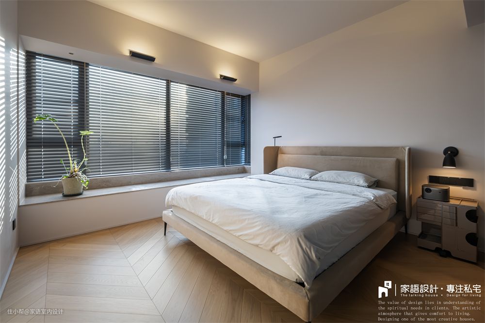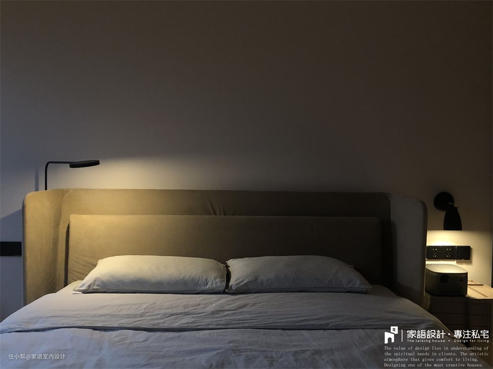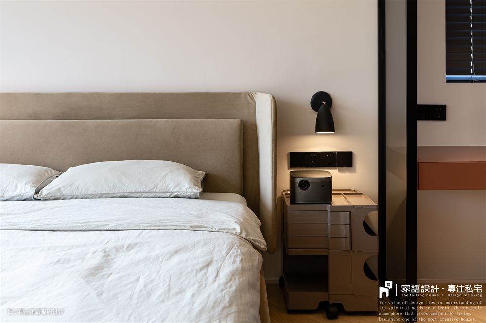 选择投影或电视?成年人当然是都要。不需要专门安装幕布,仅仅是普通浅色乳胶漆就可以有不错的投影效果,因此大床面对的墙壁没有任何装饰,我们躺在这里看电影,打游戏,不亦乐乎~