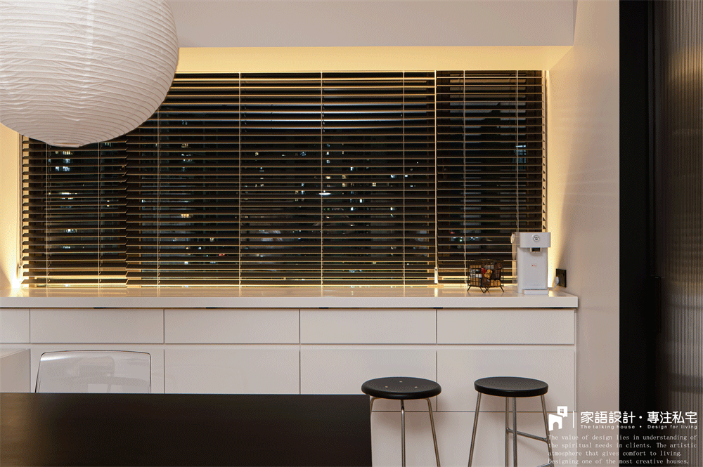 为了不使餐厅的飘窗闲置,设计师直接在原精装房飘窗上加装了储物抽屉兼吧台。 窗前的抽屉顶部是一块可移动的烤漆板,平时是普通台面,需要时拉出就成为吧台(台面上下均有灯带营造气氛)。