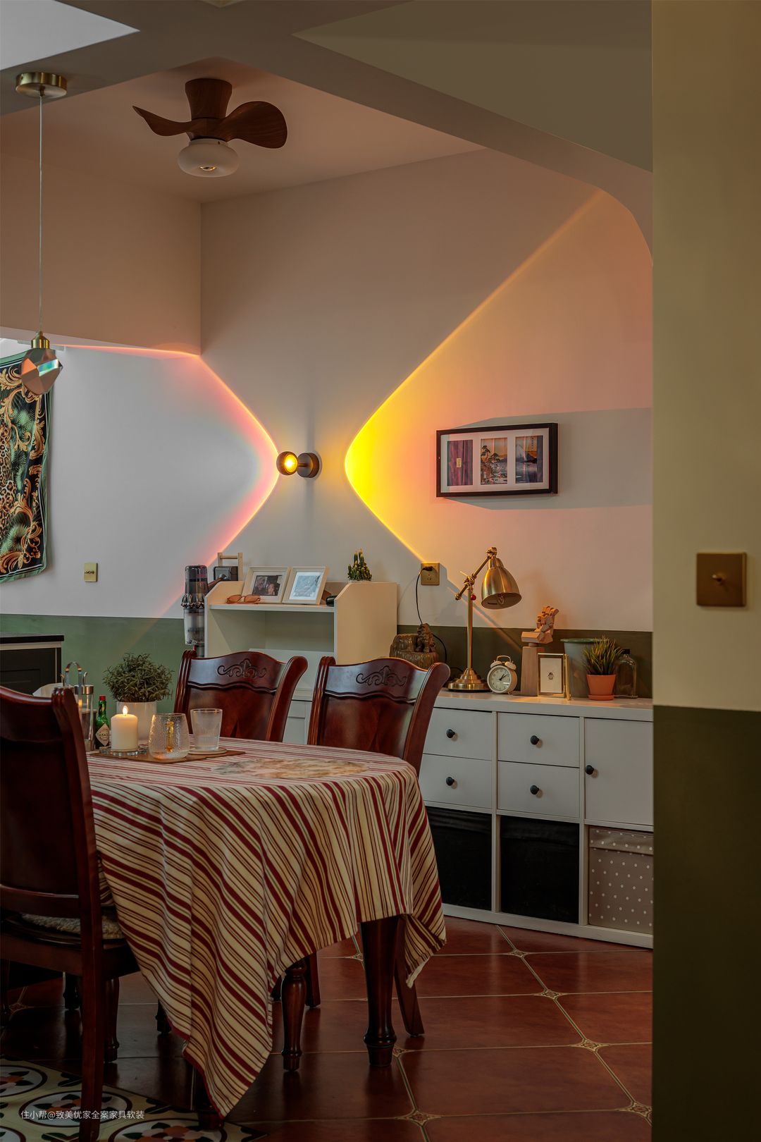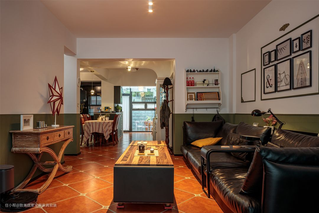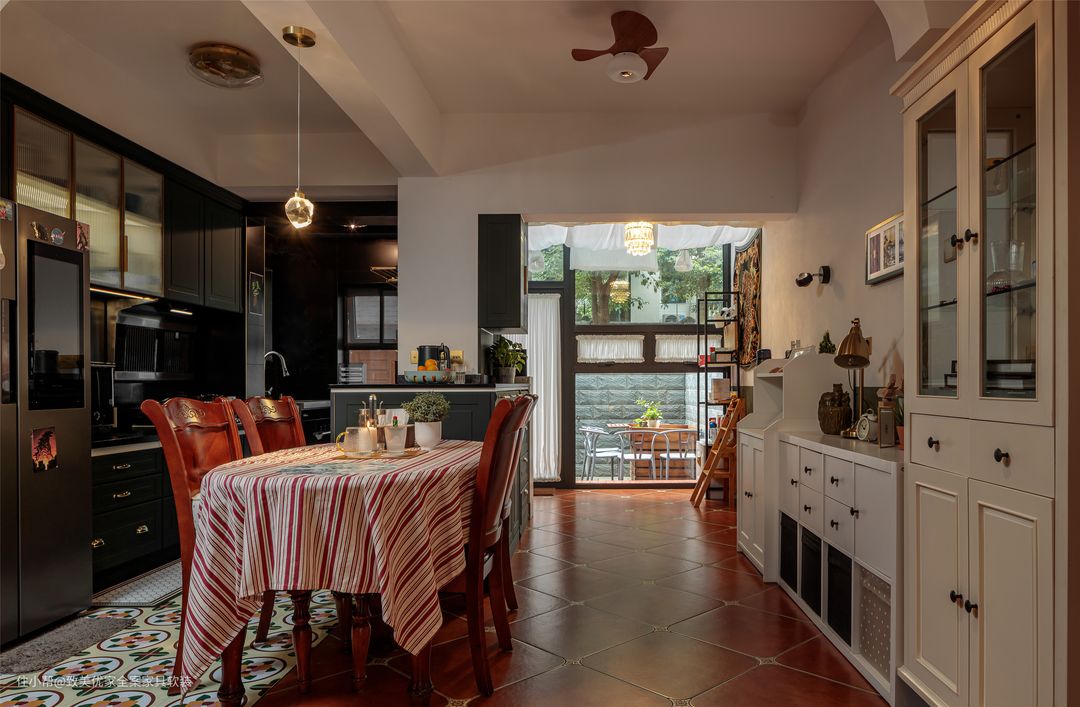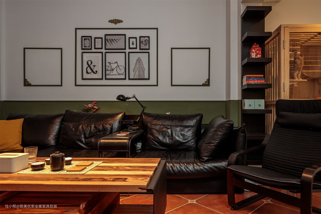 再比如,在通刷和半墙中,她选择了自带怀旧感的后者,1.2m高度不会带来压抑感,反而给墙面的挂画以及储物柜留下了大展拳脚的机会。 饶女士日常的兴趣爱好不算广,甚至不热衷与朋友聚会,她最大的乐趣就是做手工和下厨。 客厅地砖的美缝以及吊灯的电路拆装,均由她亲自动手完成。值得一提的是,美缝的颜色是根据挂画边框进行精细调色,细节之处的适配度100%。