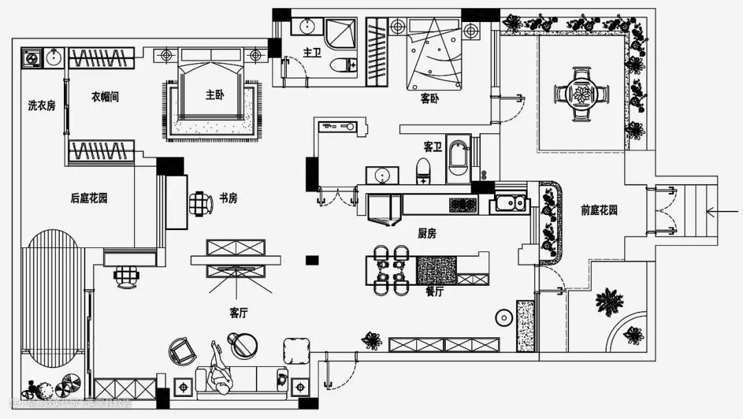 改造后▲ 厨房:打掉厨房两面的墙体,将封闭式空间改为开放式; 书房:打掉书房三面墙体,改为开放格局,和卧室以及其他空间形成通透格局; 主卧:拆除主卧与书房之间的墙体,使其连为一体,并将④和⑤处的墙体打掉,同时拆除⑧和⑦,将后庭花园一部分的空间改造为衣帽间。 花园:将⑥处改为推拉门形式;