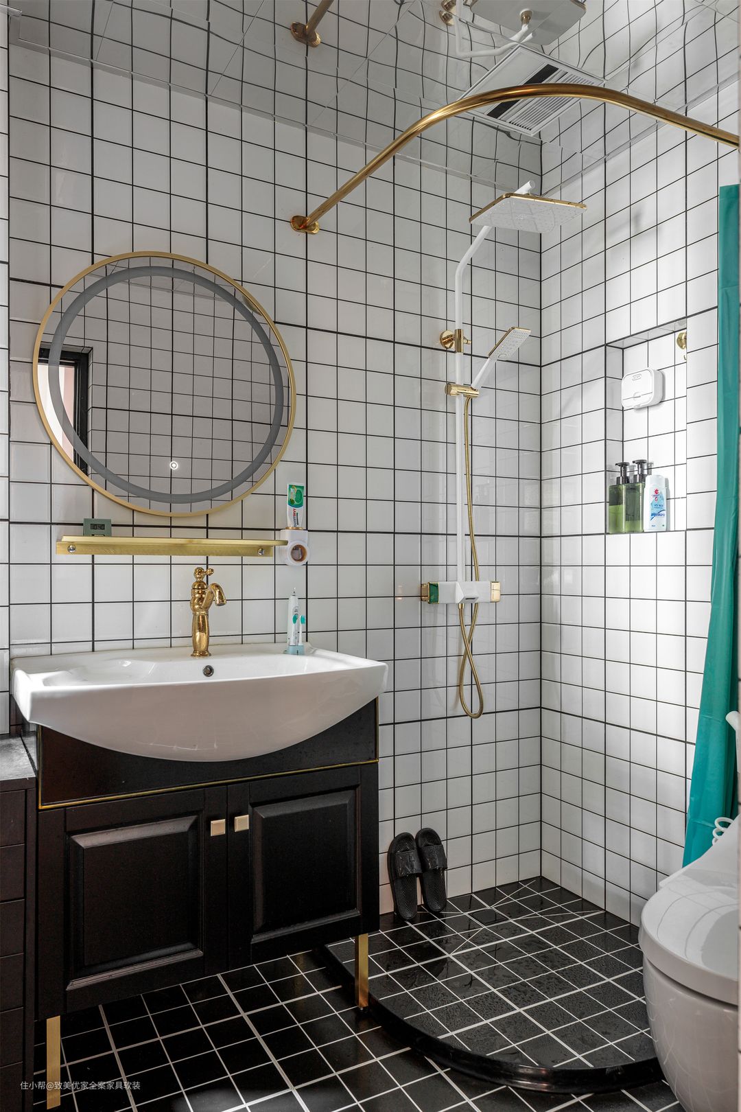 客卫采用开放式设计,以小绿砖+乳胶漆的形式营造复古氛围;走廊吊顶改为弧形门洞,并加上两扇门和一盏羽毛灯打造沉浸式的梳妆体验;主卫里的淋浴区采用镜面材质的吊顶,巧妙在视觉上增加层高。