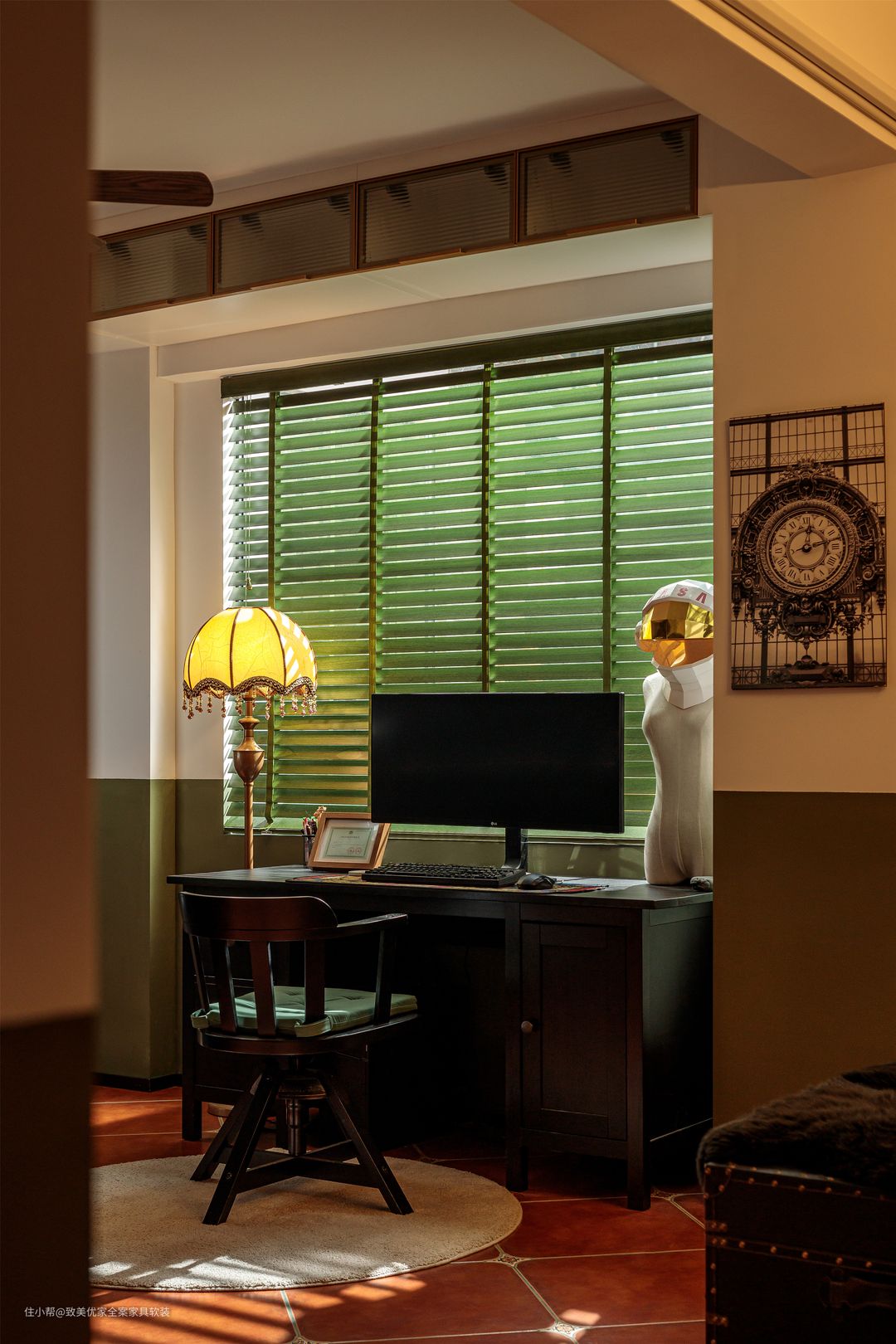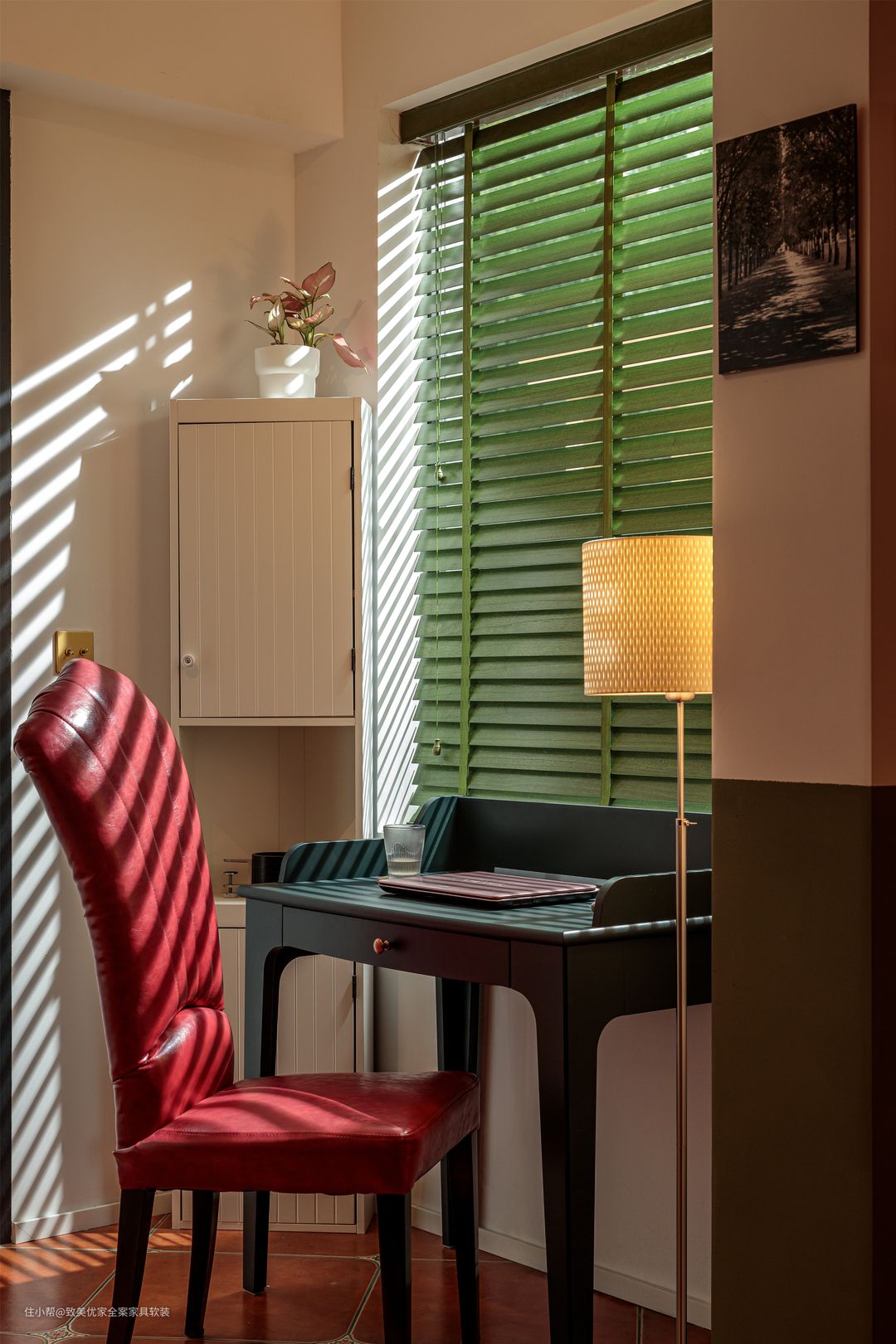 书房百叶帘与地砖美缝色彩如出一辙,均是饶女士亲自调色而成,只一次便成功,询问技巧时,她道,“技巧就是爱做手工,也与运气有点关系。