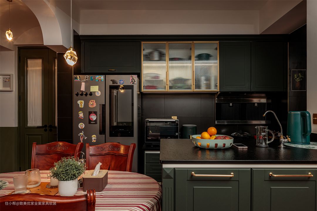 而且在我这里,四川男人应该下厨,女生应该洗碗啥的都不成立,我和他可以各自做自己爱的事,互不打扰或者甜蜜互动都是生活。” 被改为开放空间的厨房与餐厅连为一体,削弱了一人下厨时的孤寂感。L型的厨房由黑色+墨绿色橱柜组合而成。同时,为了增加视觉的跳跃感,特将吊顶以长虹玻璃的形式呈现,美感更甚。
