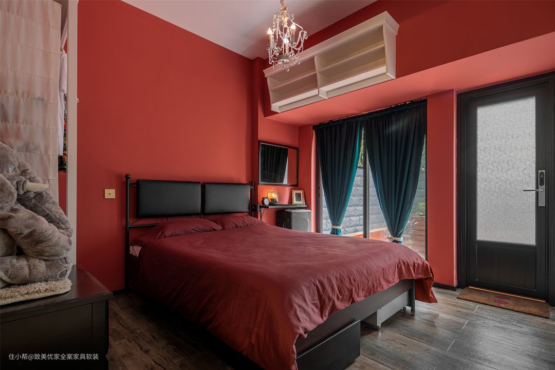 视线移至客卧时,其跳跃的配色着实让人眼前一亮。复古红墙漆与床品、墨绿色窗帘与软饰,都让这个空间呈现出另一种美感。