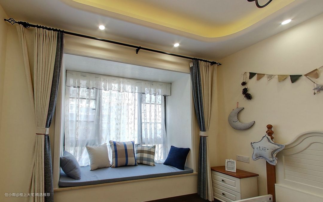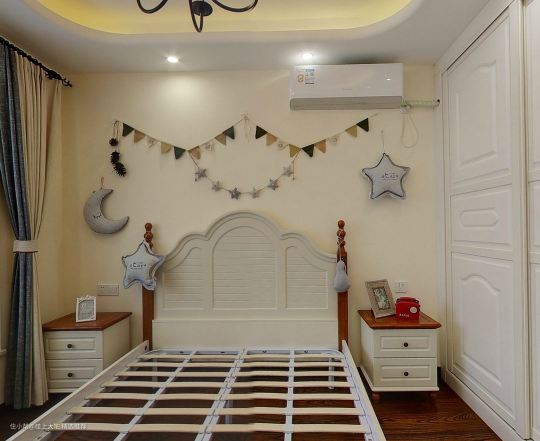 次卧的布置,为了契合小女孩天真烂漫的个性,床头的设计显得童趣十足,布艺小星星和月亮的挂饰很符合小女孩的喜好,营造了温暖童真的氛围。