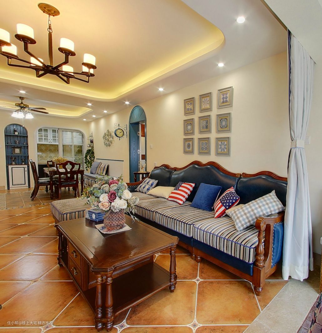 主要建材:抛光石英砖、仿古菱形转、实木卡座、橱柜、吊灯、乳胶漆、皮质沙发、木质餐桌、浴室镜
