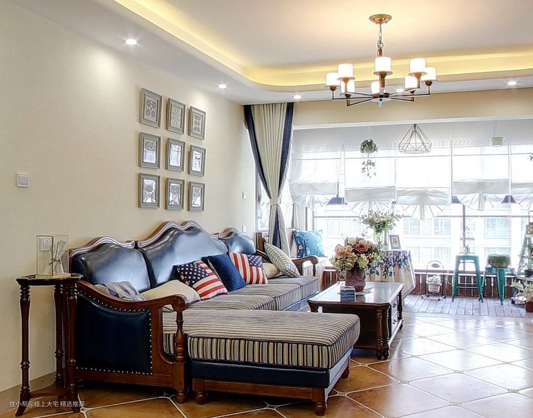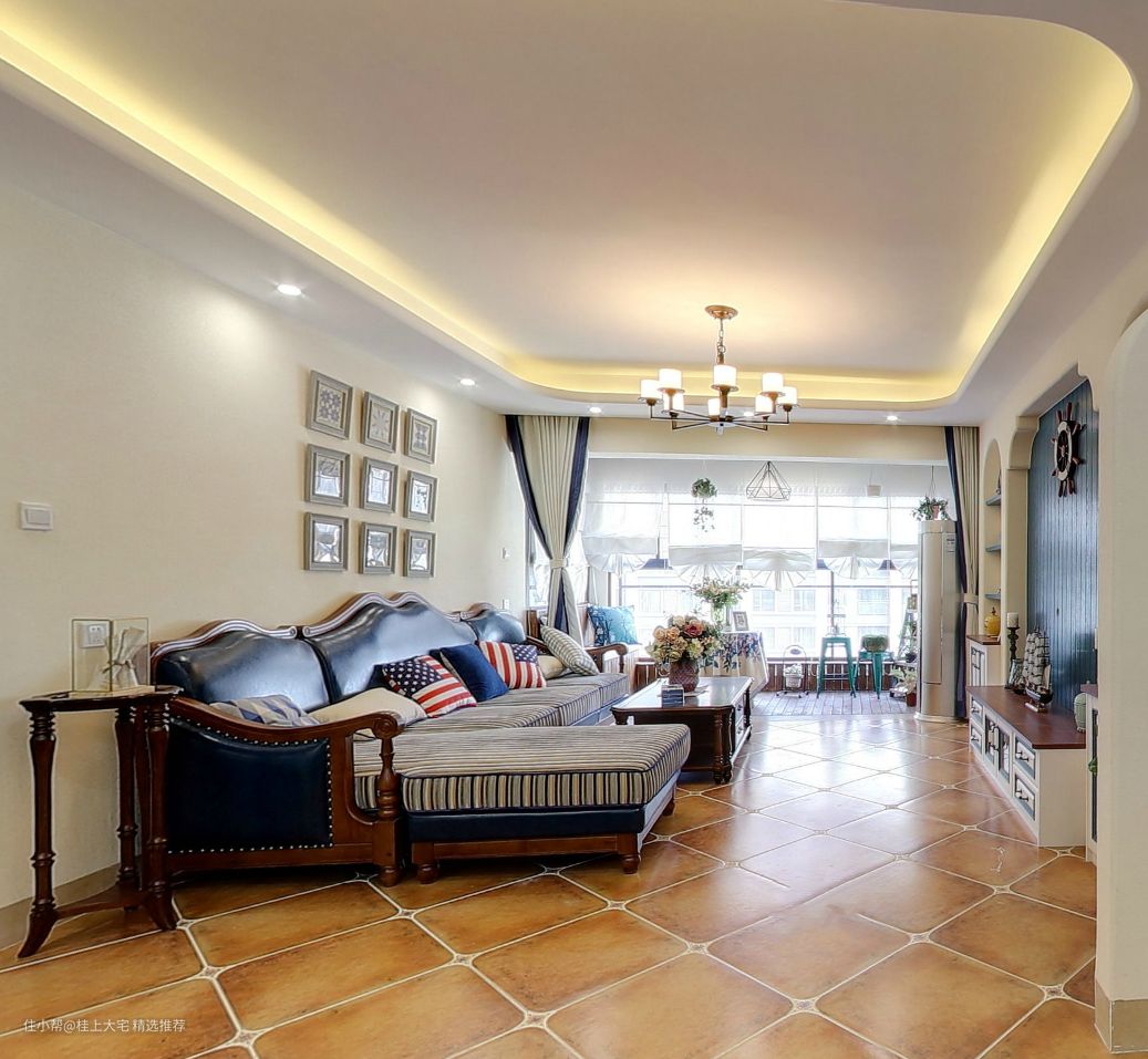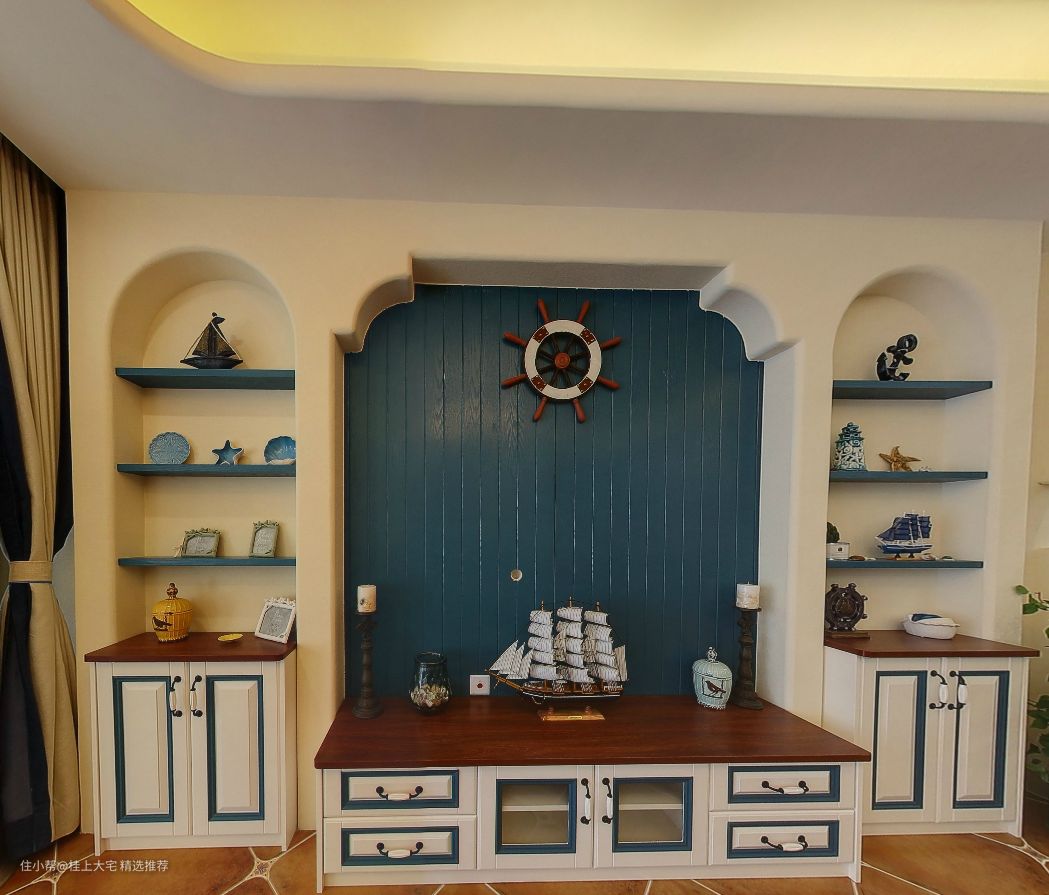 客厅整体是选择了蓝白色作为主色调,蓝色电视背景墙对应搭配了蓝色的皮质沙发,加上具有浓厚地中海风格的装饰画和一些航海小挂件,使整个空间呈现出一种清新又复古的感觉。