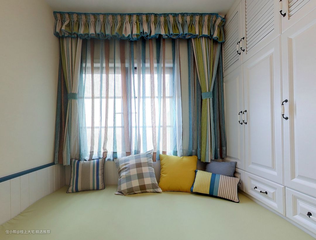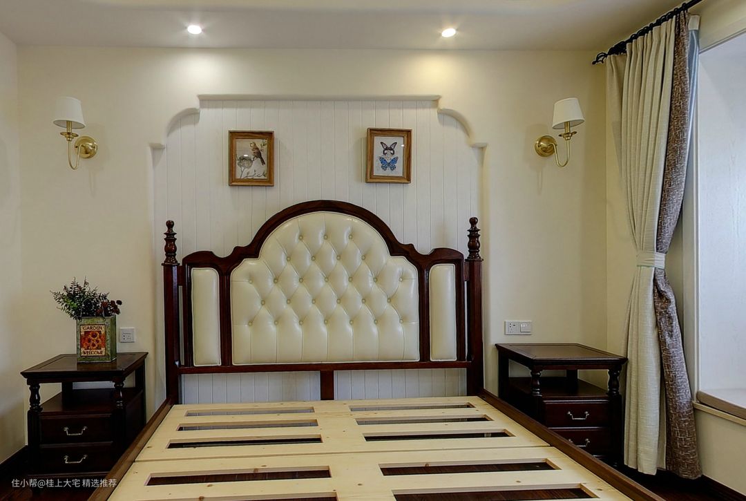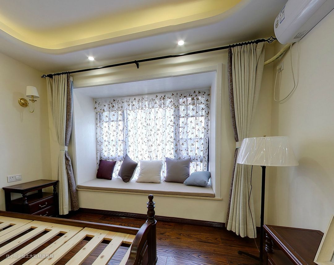 主卧选择了美式木质家具搭配田园小碎花纺纱窗帘,给人一种自在惬意的感觉,舒适的空间让人感到十分的放松和舒适。
