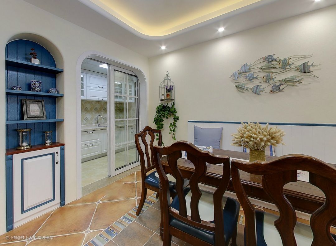 餐厅的卡座设计采用蓝白配色的储物柜和海绵质地的软垫搭配,再放置几个小抱枕,使得空间变得实用又舒适。仿古菱形瓷砖搭配彩色马赛克小砖作为填补,花朵型吊灯搭配风扇造型,营造了美观又复古餐厅空间。