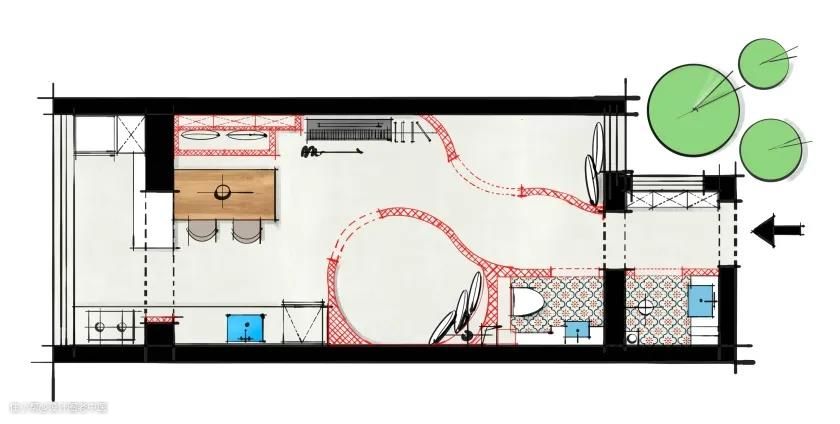 与【设计圈老中医】的结缘是个很顺畅的过程,得来全不费工夫。我这个人可能有这个特质,小事会犹豫,但大事往往决策快,不患得患失,找设计师的事儿也是这样。带着模糊的需求,某天老公翻平台,凑巧就遇到了几个设计作品,【设计圈老中医】的颇有技术含量,最有感觉。随后马上预约,见面浅谈,第二天确定签约了。 我们认认真真地填写了一份《甲方爸爸需求反馈表》,自认为是能够作为样例的那种。一周后,五个设计稿赫然呈现,包括现在出品的这款“洞穴风”。(注:红色区域为设计新建改造部分) 格局优化后: