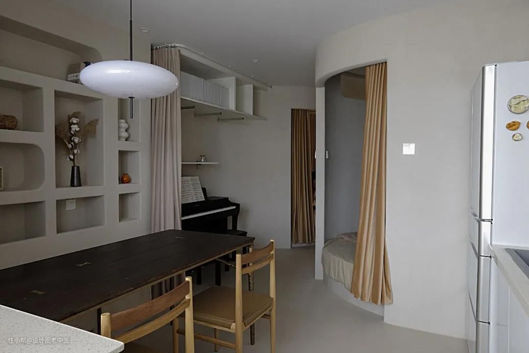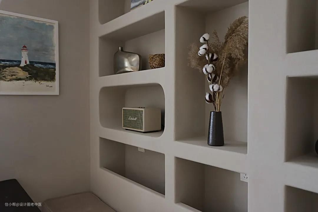 这次设计区别于传统学区房做法,设计师放弃了以木色为主调的设计效果。在材料上,墙面使用“黏土”,地面用微水泥,加上弧形墙的造型,创造了一种住在洞穴里的趣味感。天然色系的主色调成全了侘寂风格,审美在线,视觉舒适。