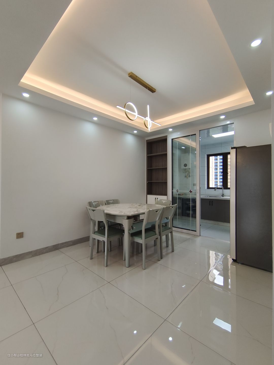 餐厅面积也挺宽的,安排了一张可以收缩的餐桌,平常做长方桌使用,人多的时候做圆桌使用,灵活方便,用的是岩板的餐桌,因为厨房里的空间不够放冰箱,冰箱放在靠近厨房门旁的餐厅里,空间也足够