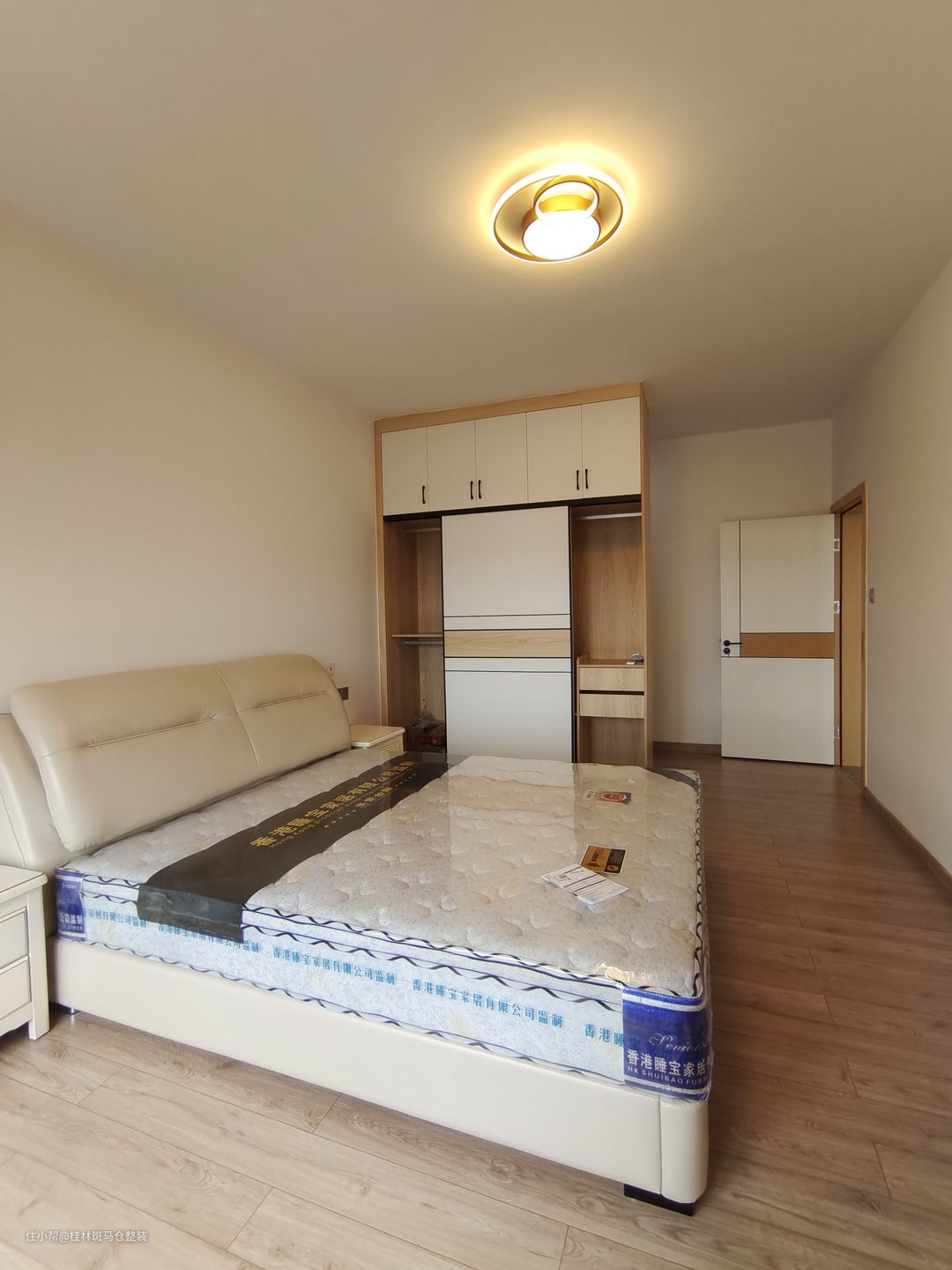 做了一整版到顶衣柜,挡住了主卧卫生间的门,也让整个主卧空间不显得过于大