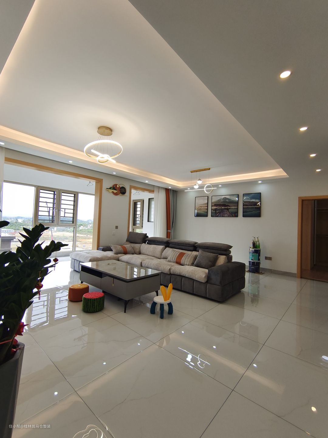 采用800*800的东鹏瓷砖通铺到阳台,卡仕白的颜色,简单百搭;以沙发作为区域分割,一边做常规客厅,一边做多功能区,可以放茶座或者一个小吧台,或者放棋牌桌,灵活使用。吊顶做了回型边吊,搭配筒灯和灯带,满足照明和氛围的点缀作用。