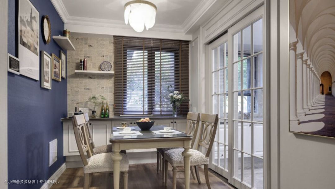 餐厅是家居生活的心脏,也是本案整个设计的亮点。整个空间非常具有画面感和视觉冲击力,犹如电影片中的定格场景。整体以温馨柔和为基调,顶部简单的吊顶突出灯具造型的艺术魅力。蓝色的底调和客厅的沙发背景遥相呼应,让空间的比例更加修长,精美的复古的挂画,也添加了餐厅的情调。