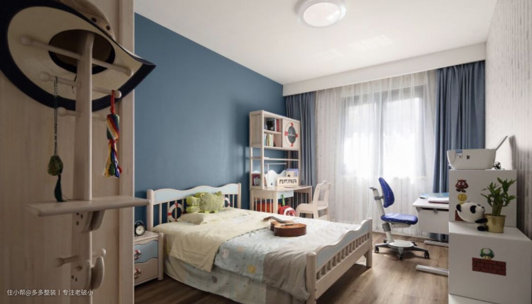 小孩房的设计几乎没有赘述,以最本真的形态展示空间张力。墙面浅灰图案的主基调加以海蓝色的床背景与卡通元素点缀,让男孩的空间充满活跃的气息。美式格调的学习桌和书架更是让空间显得优雅童趣。