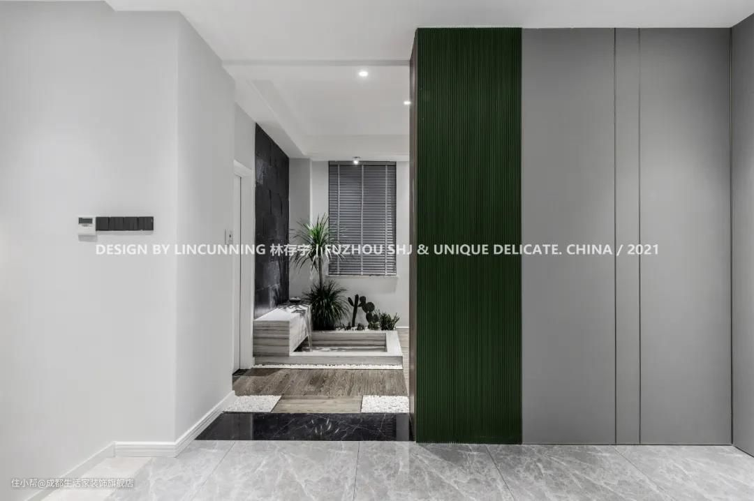 光影融合材质打造了一个无限恬静之感的艺术化空间。全案是无主灯设计,在天顶嵌入筒灯,组合轨道灯切合整体布局,豁然呈现沉默温柔的力量感。