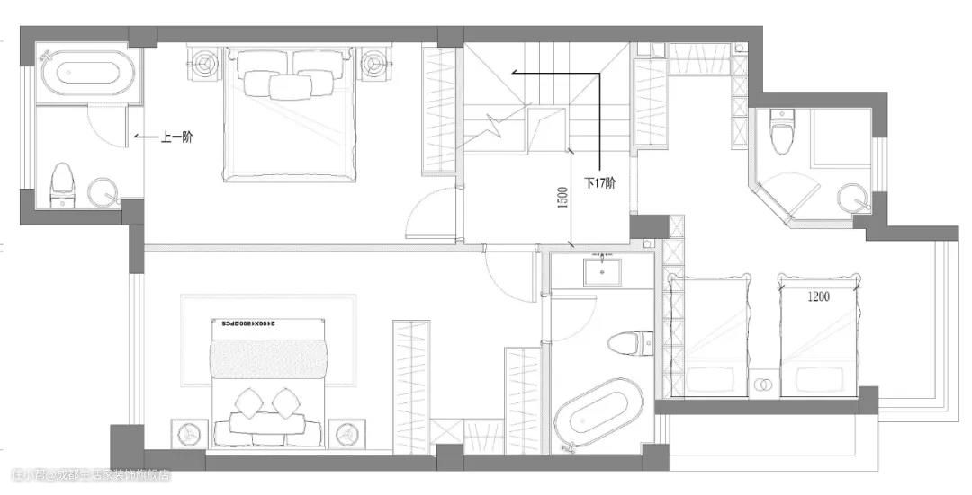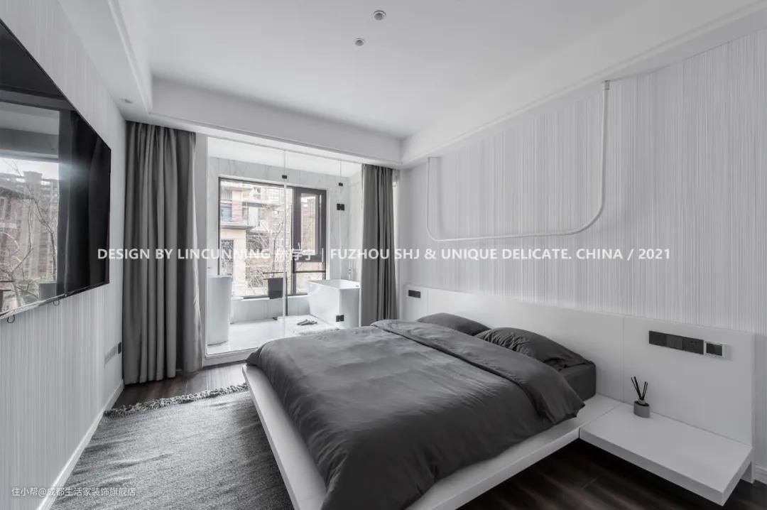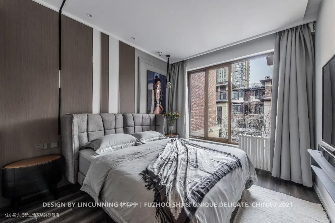 二楼设置三间起居室,延续简洁时尚格调。主卧黄铜金属布线,为木饰面加入新意,平衡生活舒适性与艺术高级感。