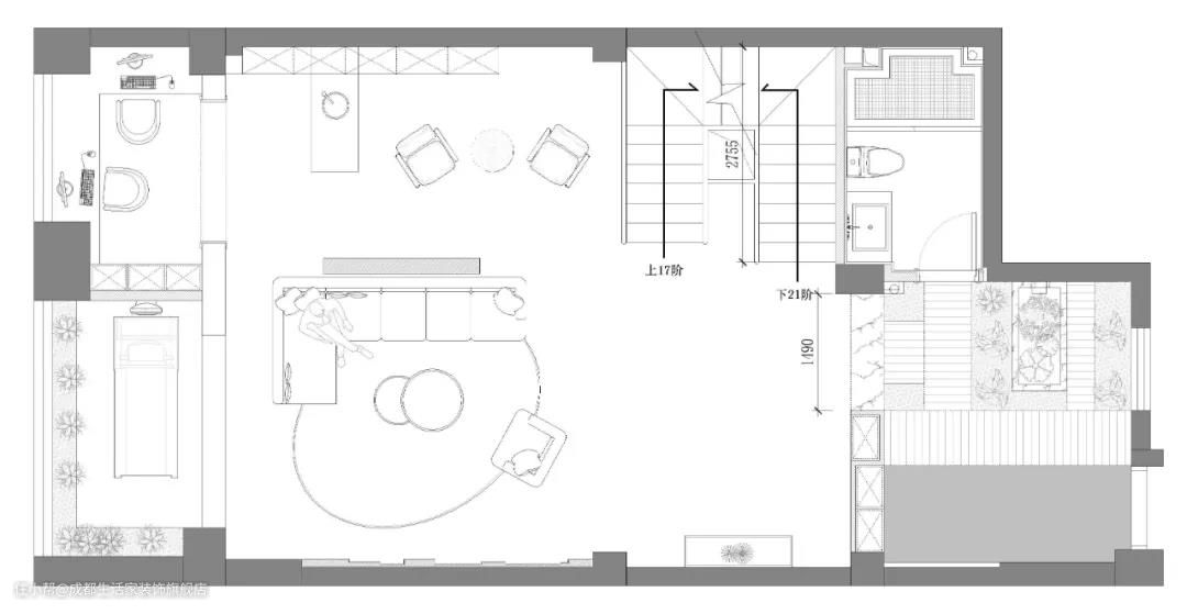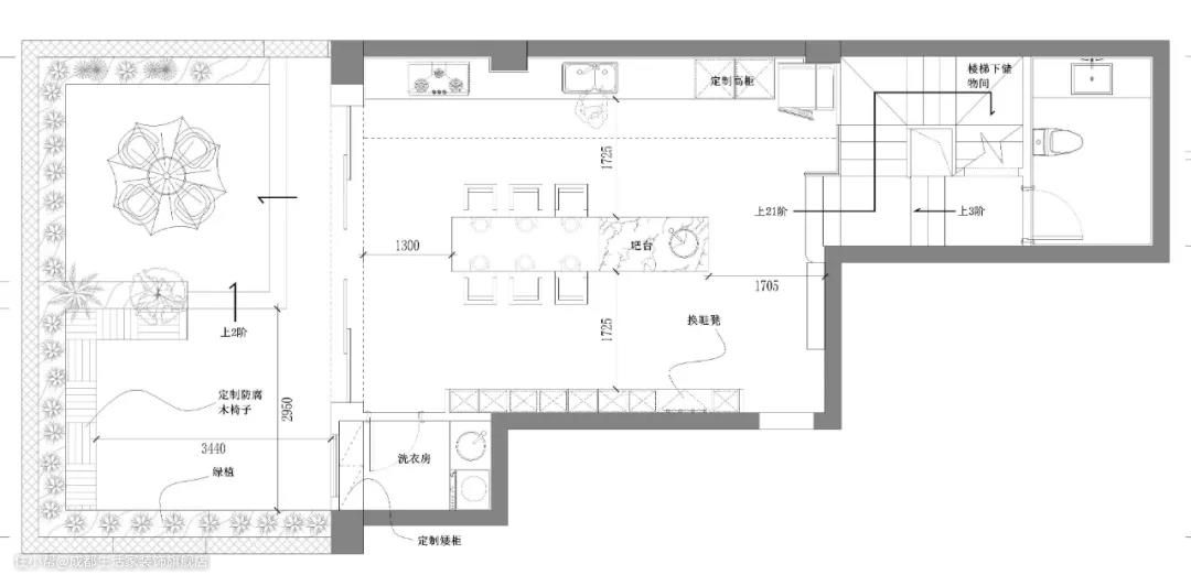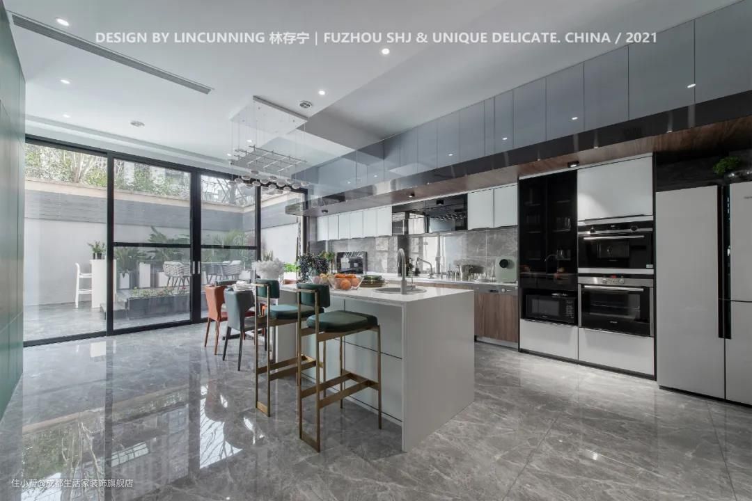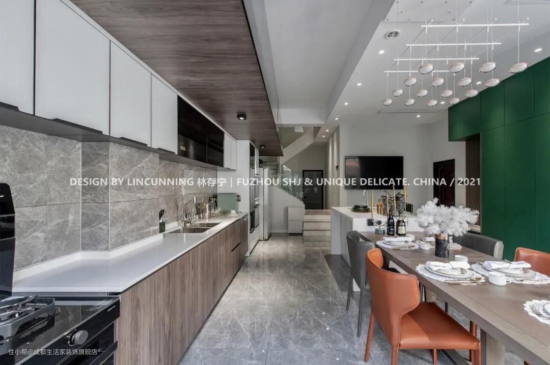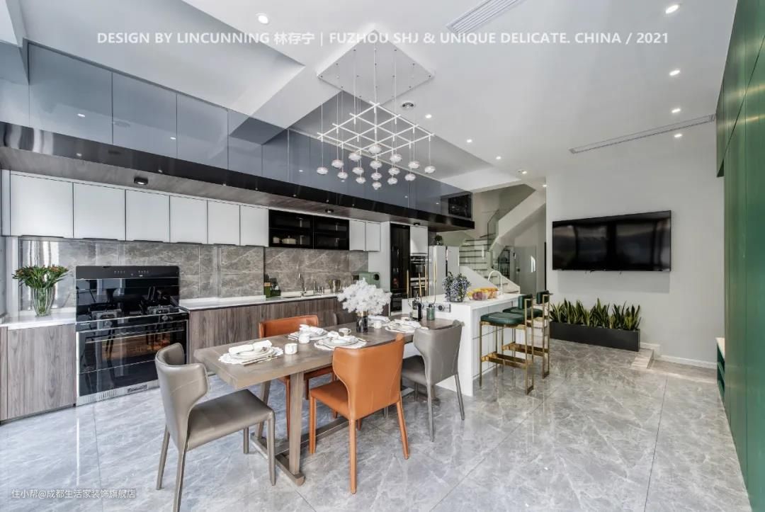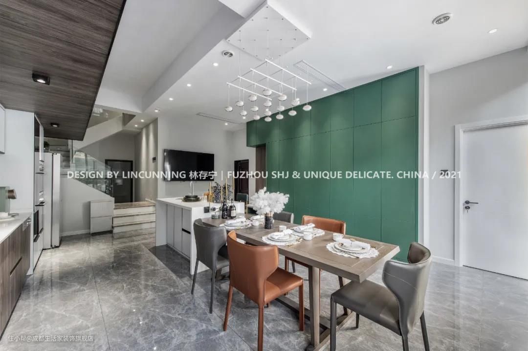 餐厅自成一景,迎光入室,储物墙兼具美学效果,加强空间的纵深感。地面浅灰石材与天花板、吊灯上下相互呼应,呈现互融相通的共处格局。