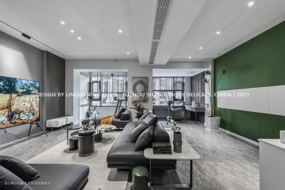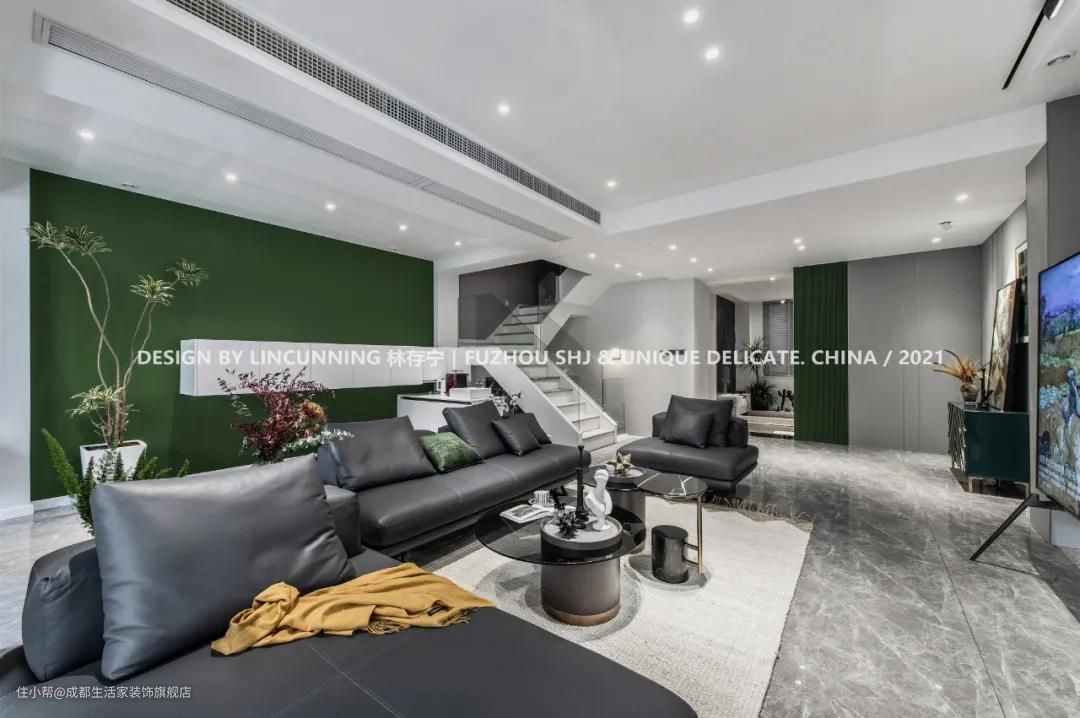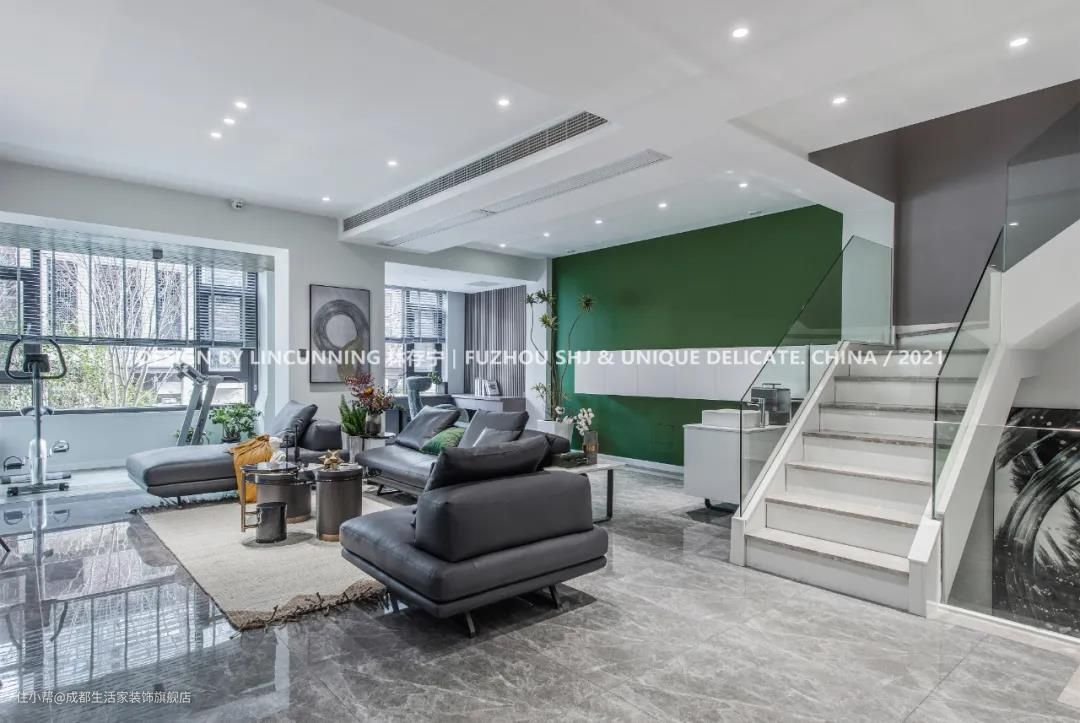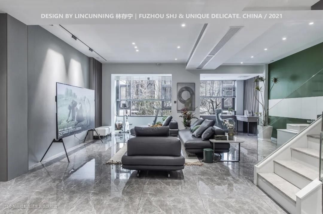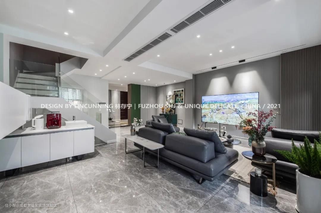 全屋共有三层,以太空银打造空间主旋律,搭配格栅、大理石丰富细节质感,调和自然绿、点缀爱马仕橙,让整体氛围在克制之内摇曳生姿。