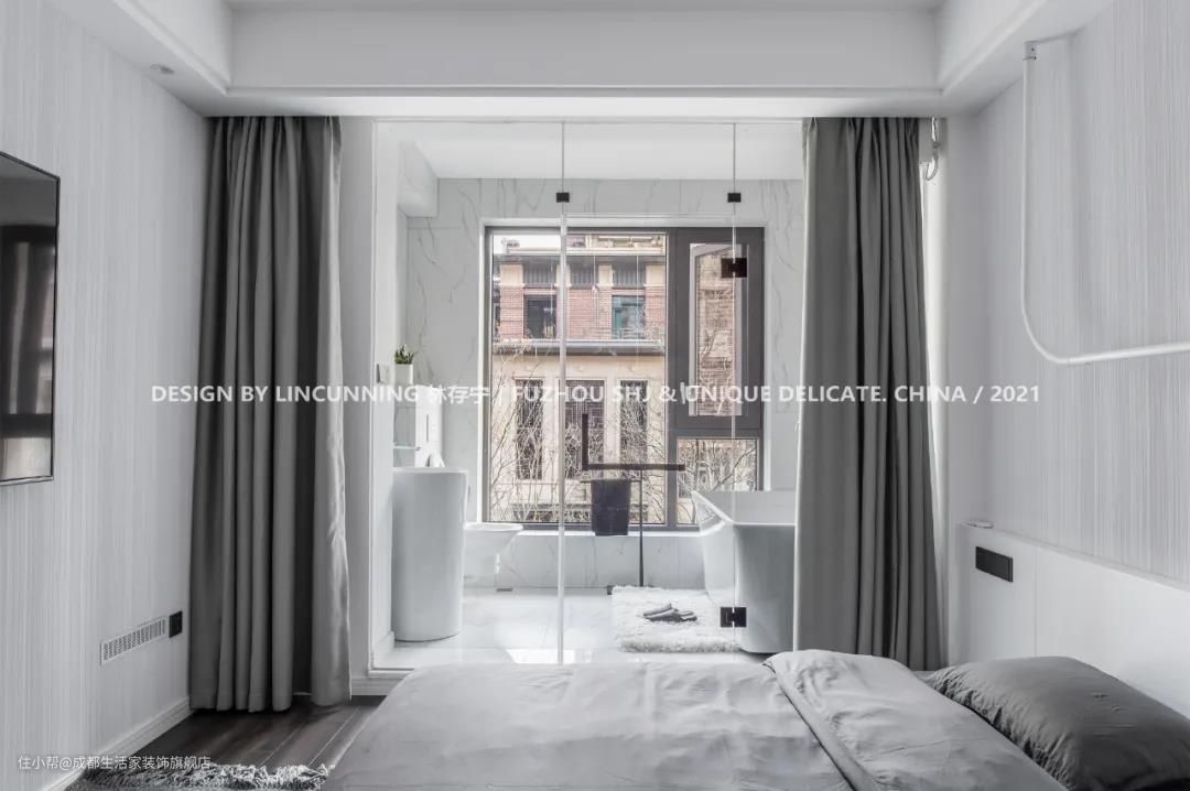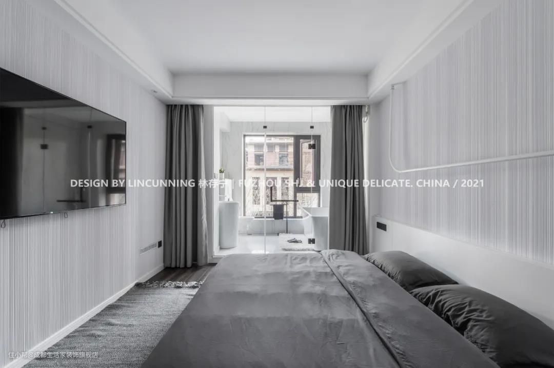 次卧注入月球漫步的灵感,以白灰为基调,营造出纯净自然的空间氛围。地空深浅相伴的灰是浩瀚星辰的探索,增加空间的立体层次,简洁美观。