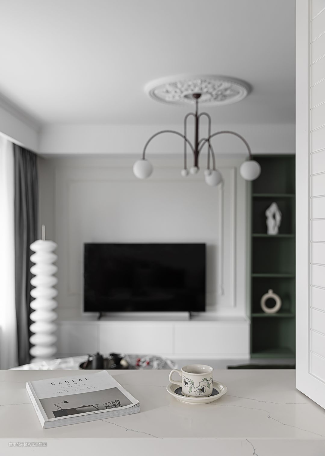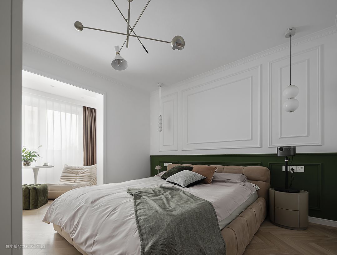 主背景墙采用上白下绿的石膏板上墙装饰,利用石膏板线条做成的几何造型,来呈现空间的层次感。